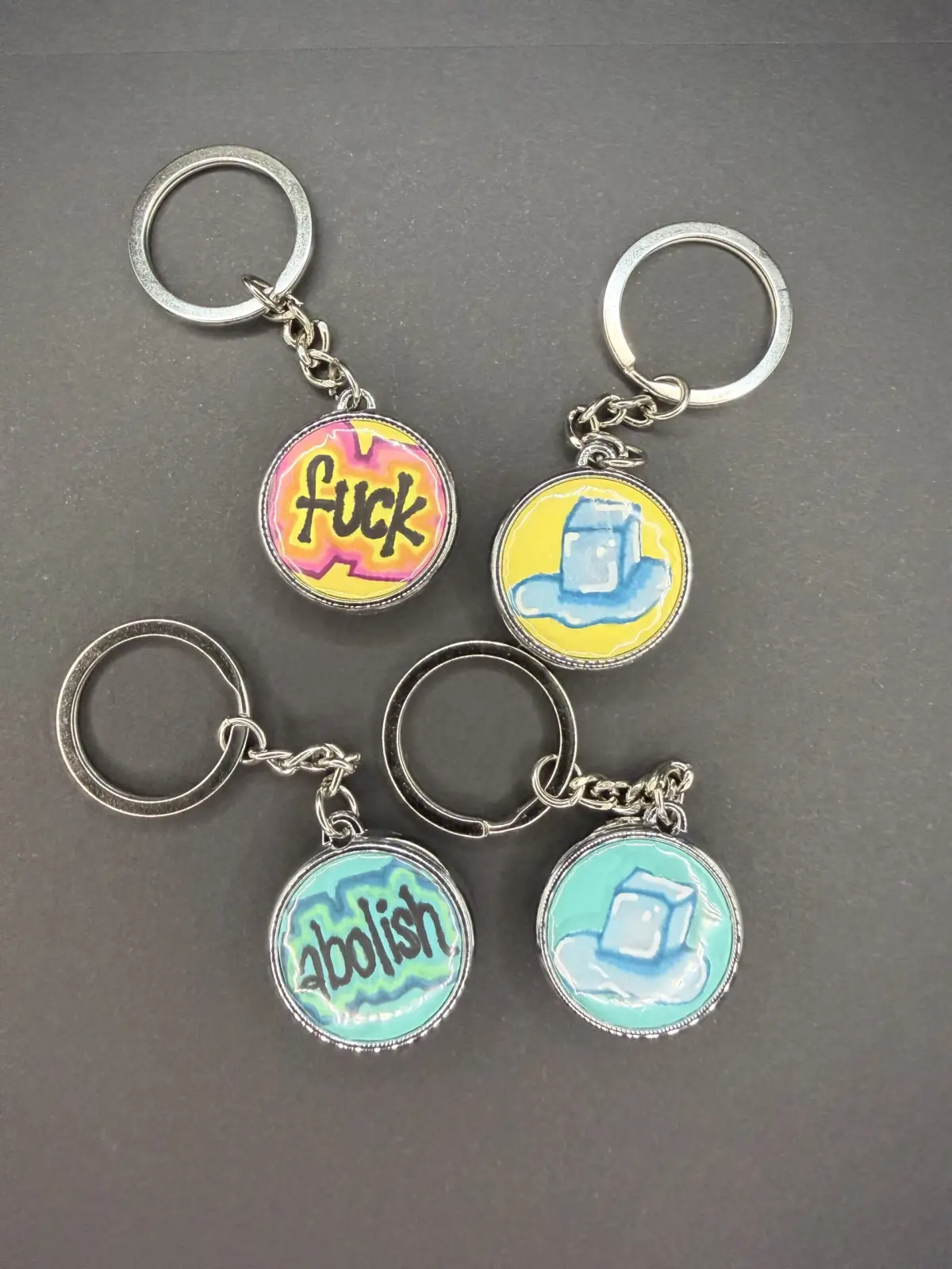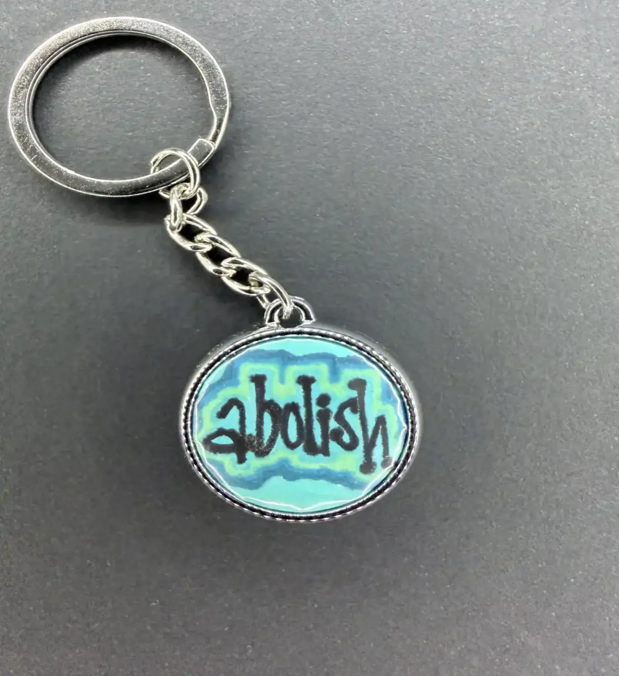 Carry your convictions everywhere you go! This hand-drawn double-sided keychain features “abolish” on one side in bold lettering against a swirling teal and blue background, and a melting ice cube on the other side… a clear, unmistakable message about where you stand.