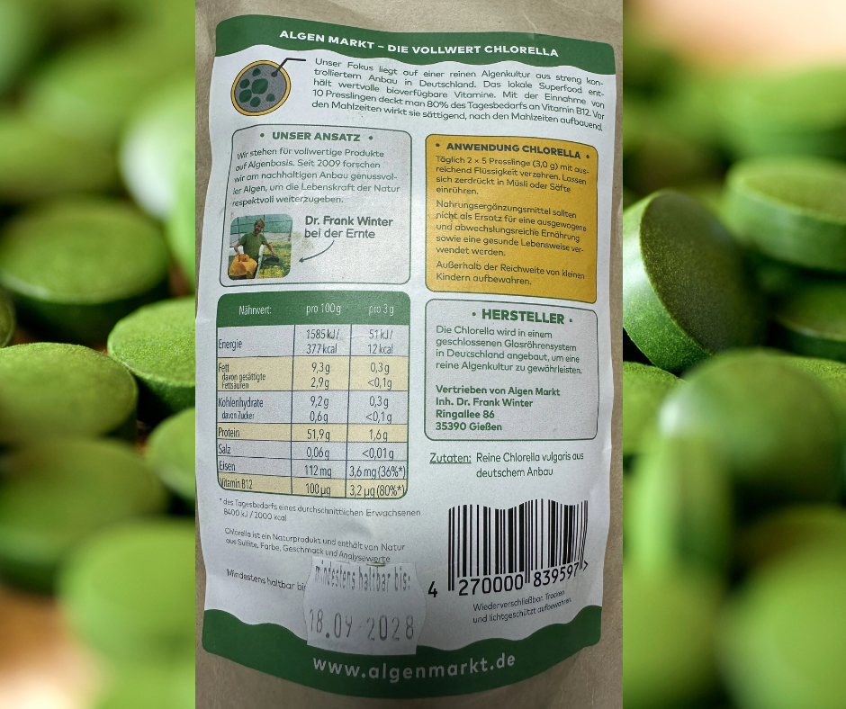Ingredients: Chlorella vulgaris from German cultivation. Each tablet contains 300 mg.