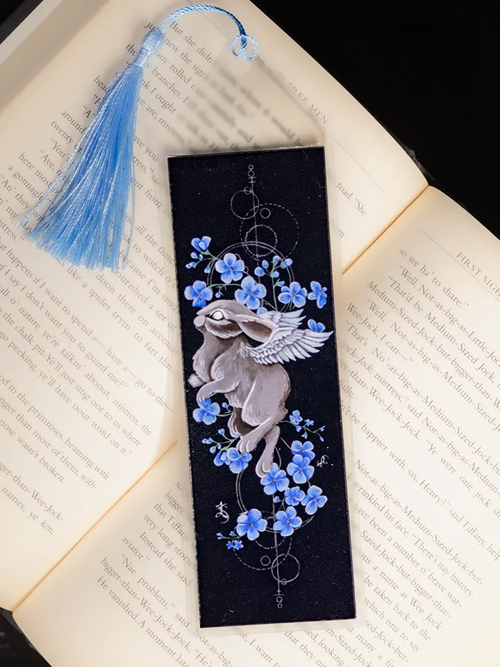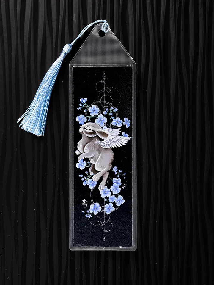 Bookmark with original angel bunny painting. Bookmarks come sleeved for protection with a colored tassel. Tassel color may vary but will match the bookmark as best as possible.