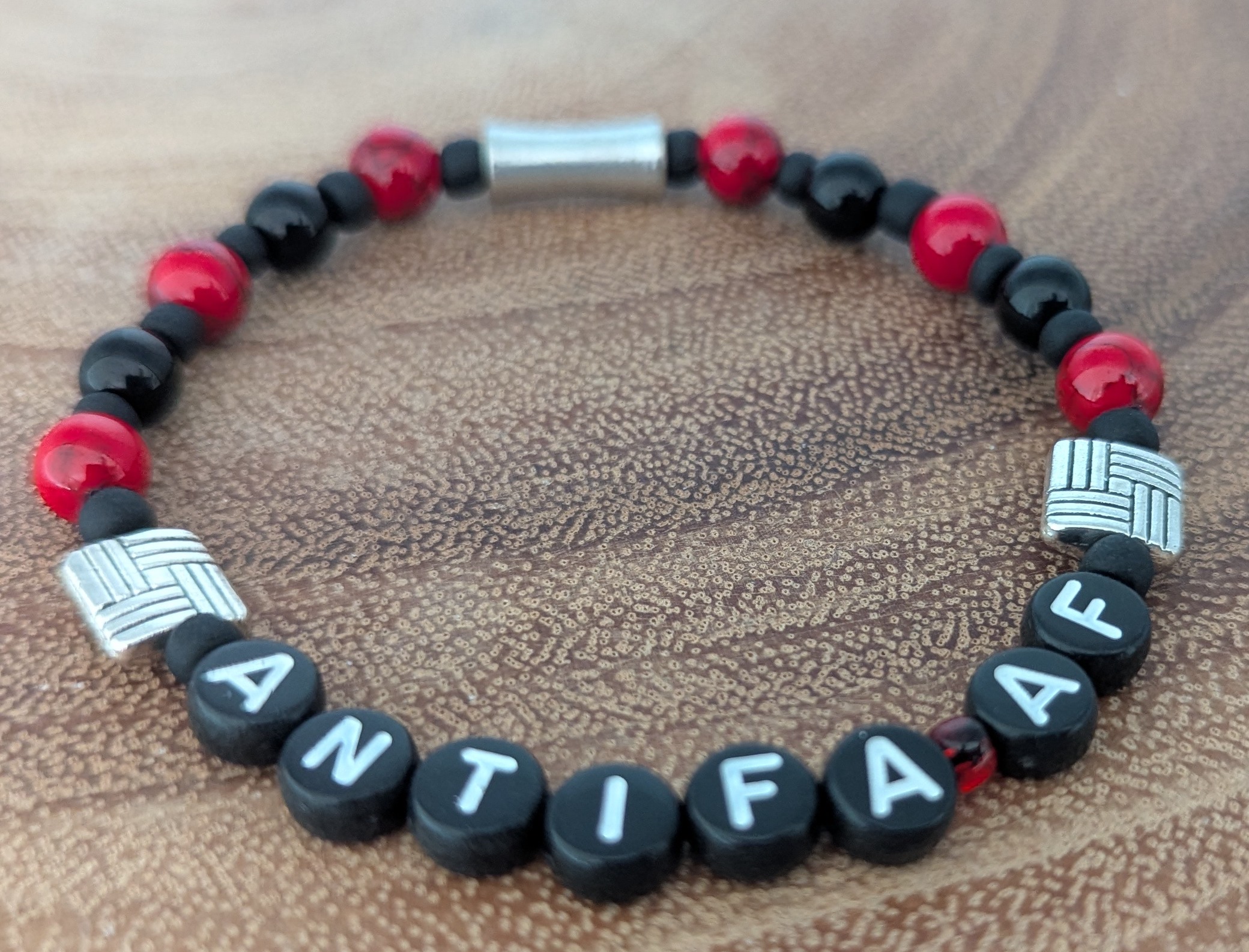 Antifascist message bracelets: Antifa, and Antifa AF. Unisex Sstretch bracelet created with red and black gemstone beads. Each bracelet is created by hand, with the energy that comes from anger. Comes on an ANTIFA/ANTIFA AF card, in gift bag. Choose your style, choose your size: Small (6.5 inches), Medium (7 inches) or Large (7.5 inches). Please let me know if you need a size outside of the range offered here.