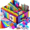 PREMIUM VALUE: Kit includes: Pipe cleaners (standard, striped, and wavy), pom poms (standard and spiky), pop sticks (multi-colored standard and slotted), googly eyes, sequins, spin pins, beads, felt strips, colored papers, rhinestones, feathers, scissors, glue, and a storage bin with dividers.