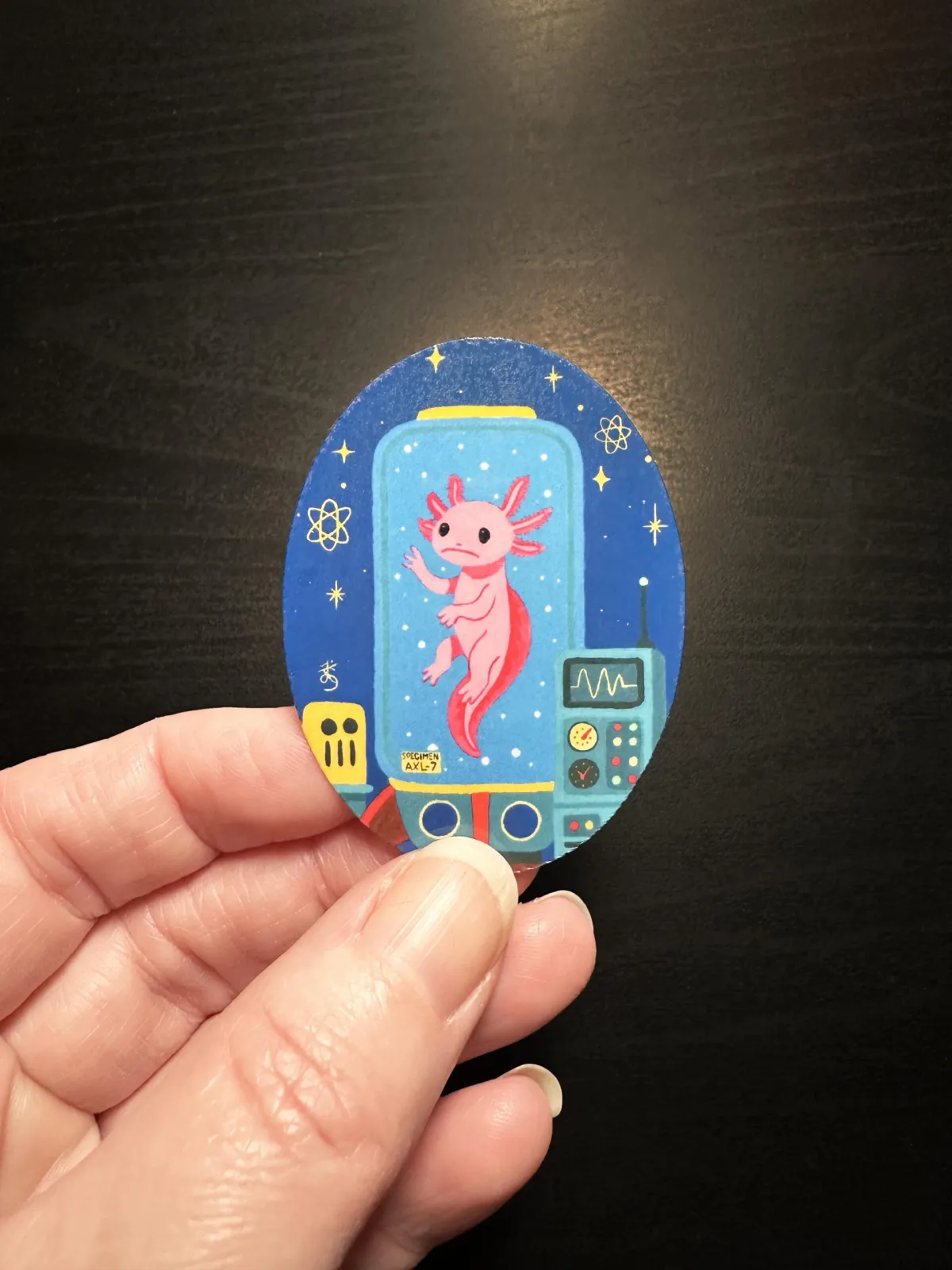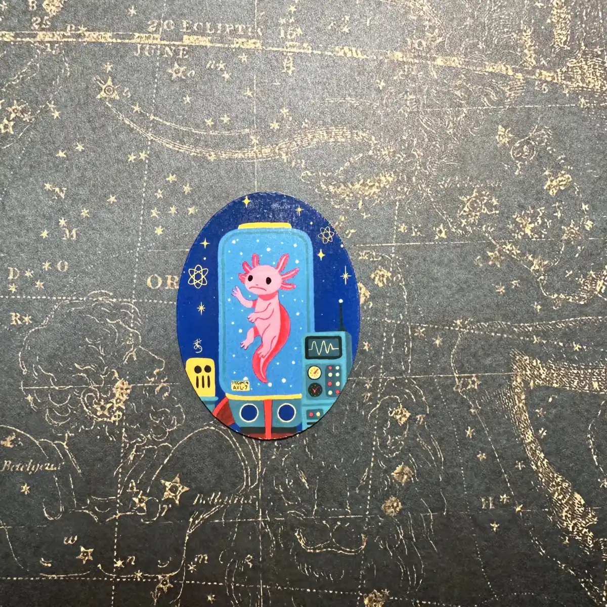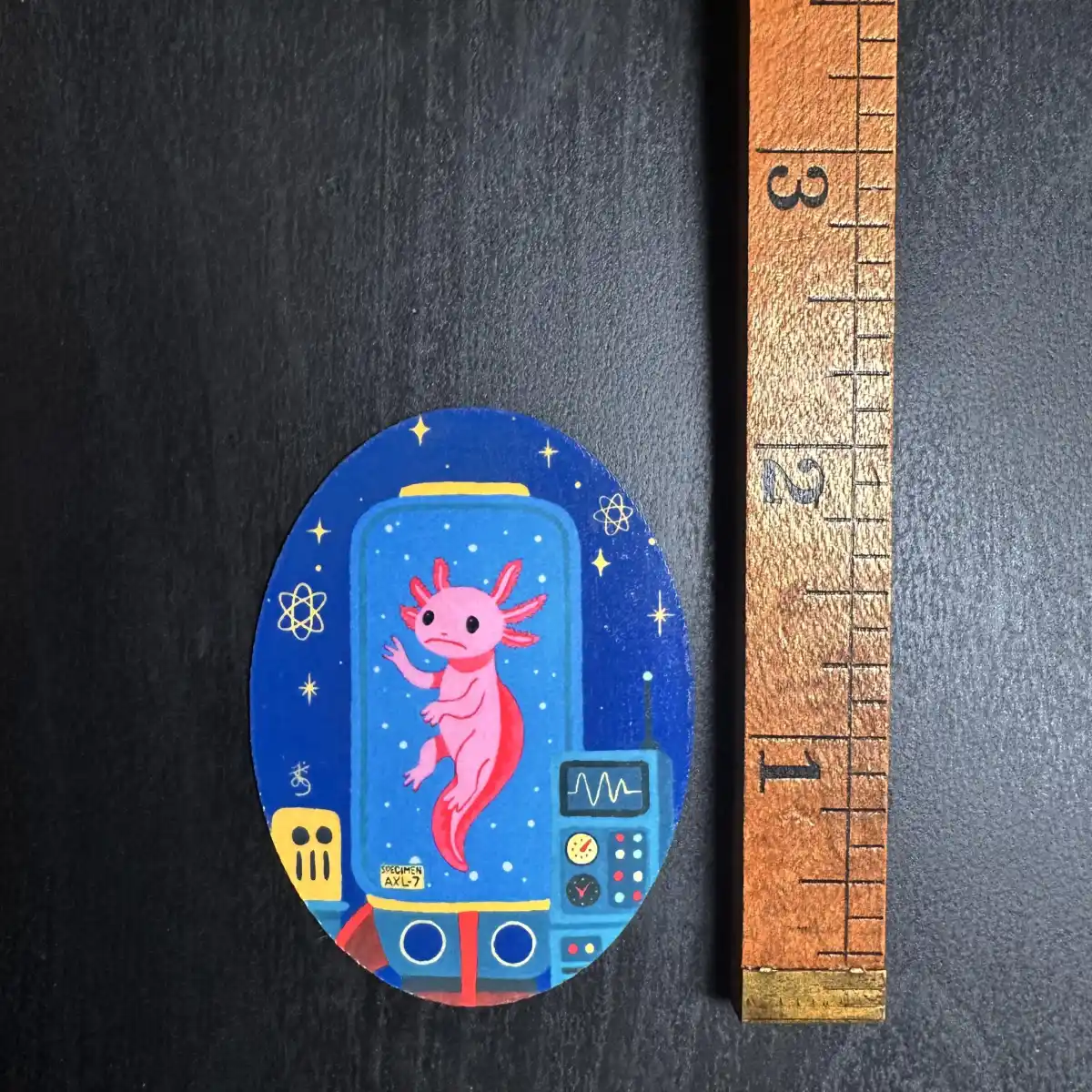 Atomic age Axolotl sticker! Stickers are made from original acrylic paintings that have been digitized to be printed on stickers. Each sticker is printed on high-quality glossy vinyl and finished with a clear laminate. This sticker is just over 2 inches tall, but if you would like a different size feel free to reach out to me using the “custom request” option.