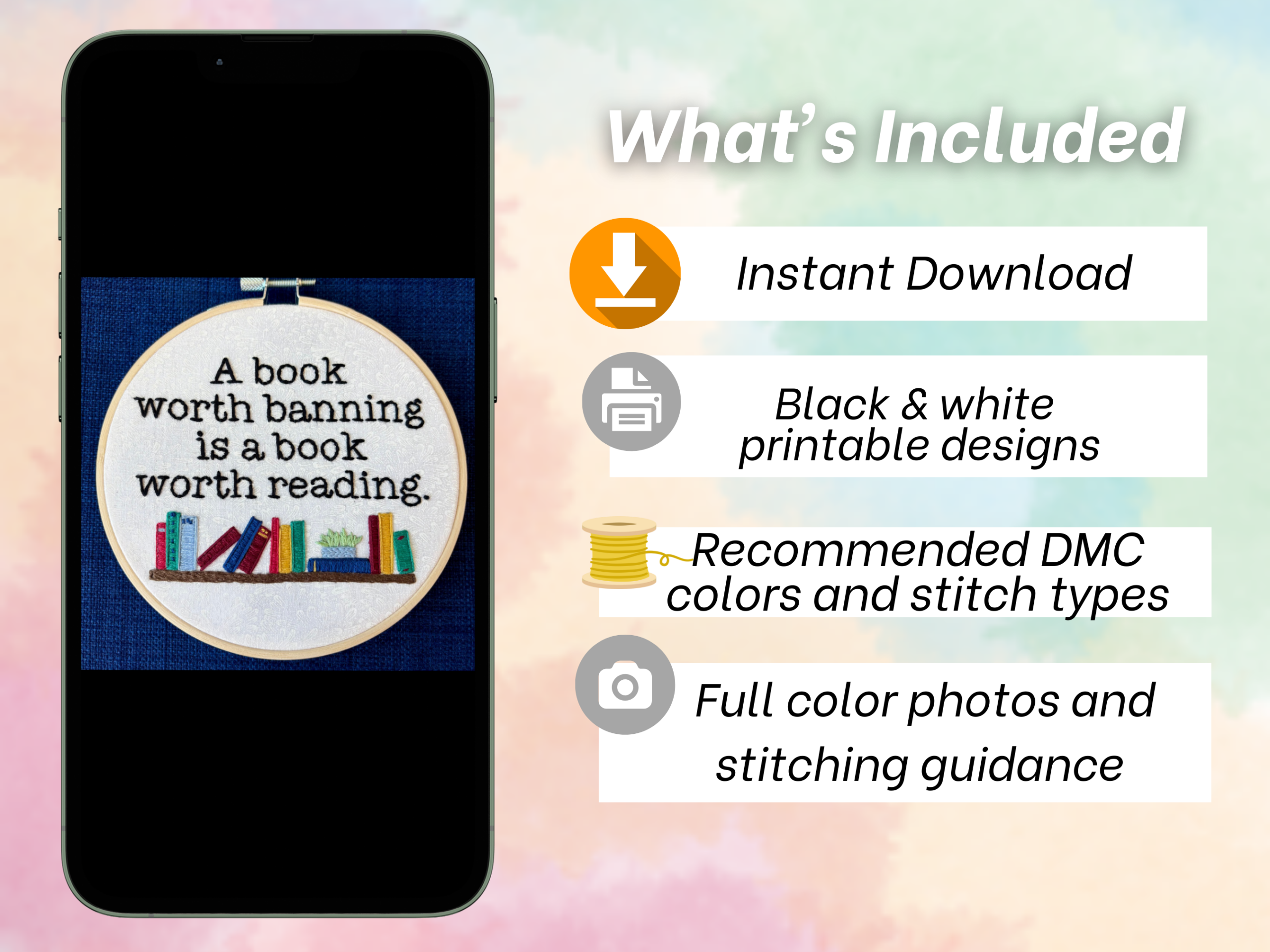 Banned Books Hand Embroidery Pattern: Snarky Quote, Bookshelf, Plant (PDF Digital Download)