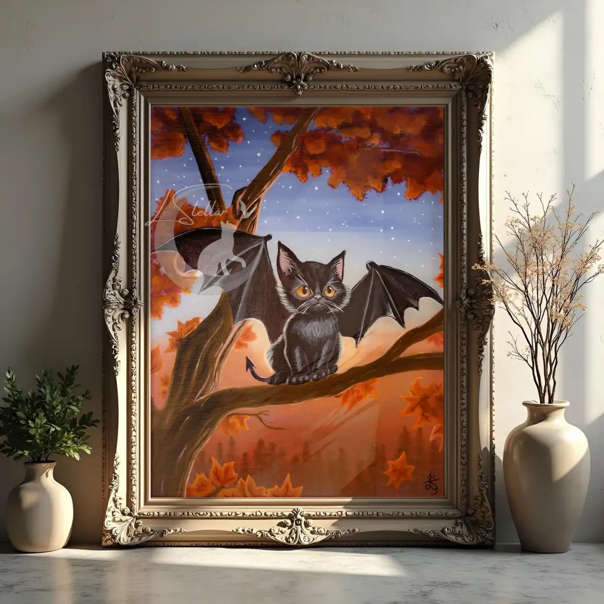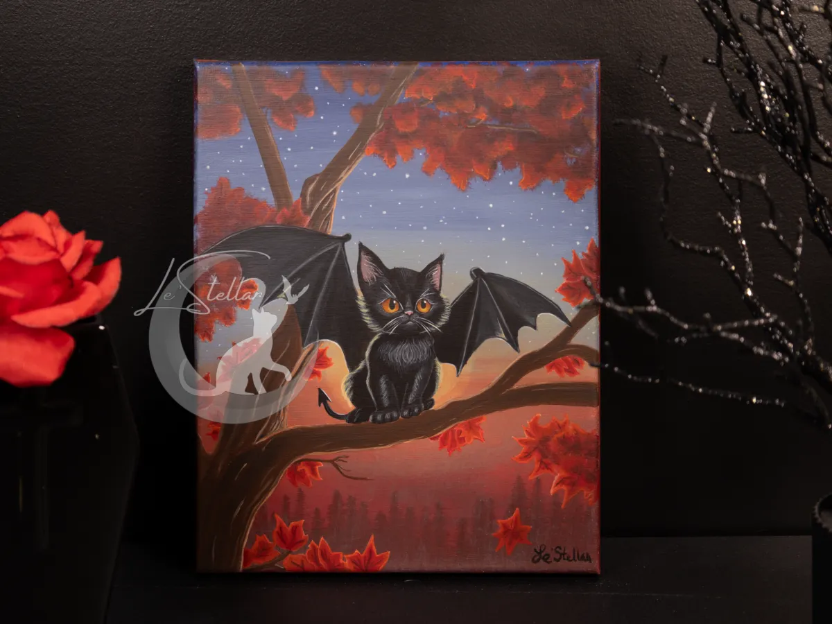 Spooky Fantasy painting of a Bat Cat sitting in a tree over looking the splendors of Fall. This black cat has glorious bat wings. This is the perfect home decor for those that love both bats and cats, like I do. Would make a great additional to your everyday decor or for Halloween.