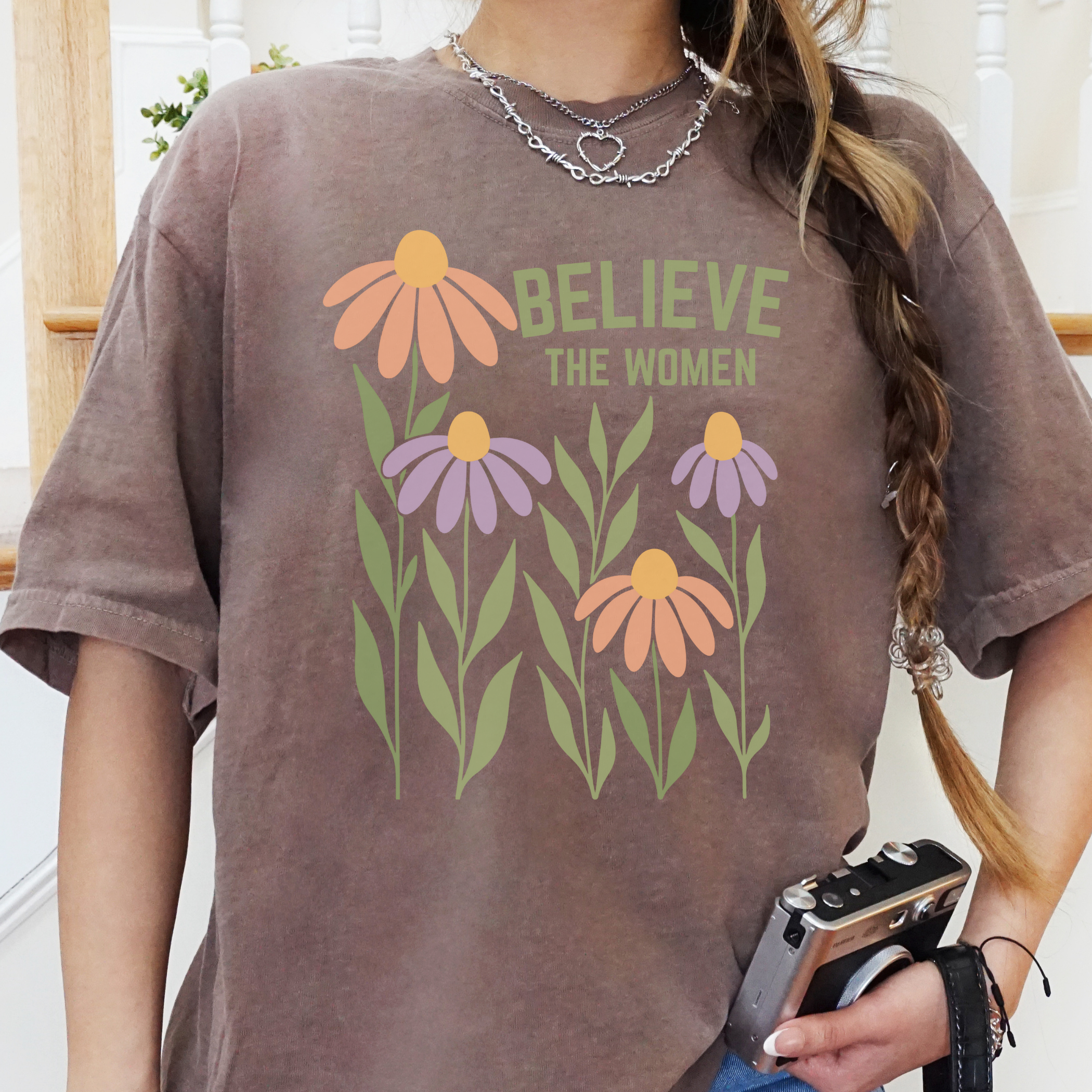 Show your support for women in general as well as survivors of the Epstein horror with this beautiful “Believe The Women” feminist t-shirt! Featuring a gorgeous floral design with colorful daisies and green foliage, this empowering tee is perfect for rallies, everyday wear, or gifting to the strong women in your life.