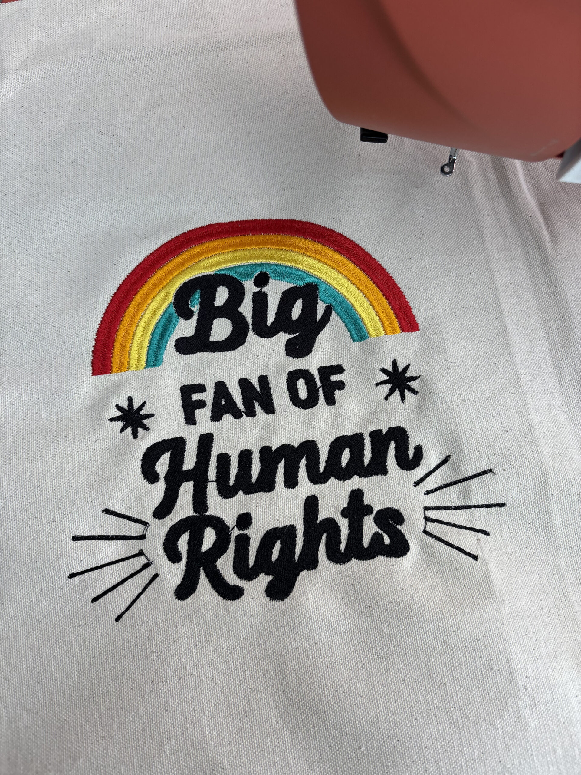 The bag features “Big Fan of Human Rights” with a rainbow design. The embroidery is placed by machine, and the bag itself is handmade by me 🙂