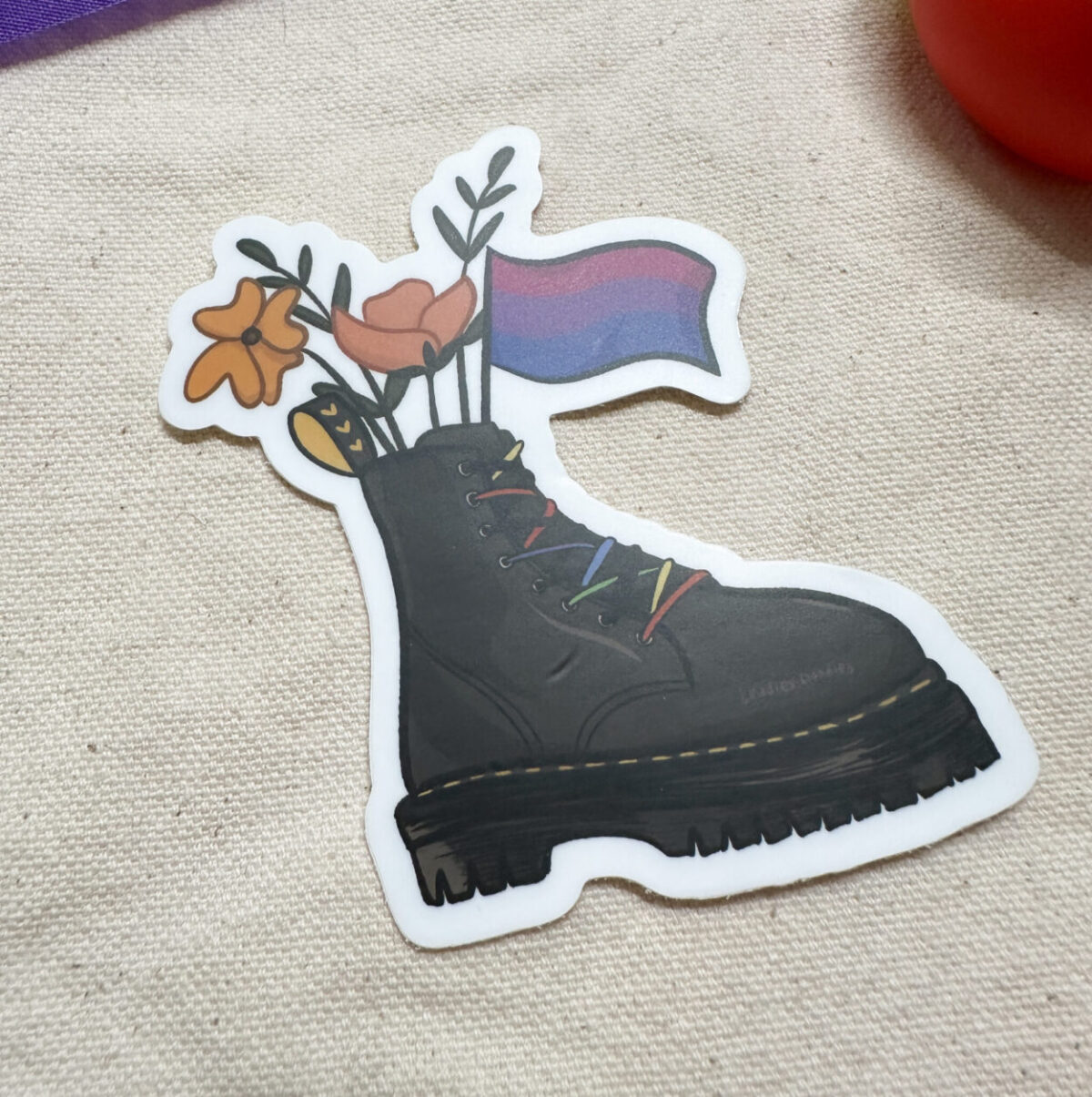 This combat boot bouquet features a bisexual pride flag and rainbow shoelaces.