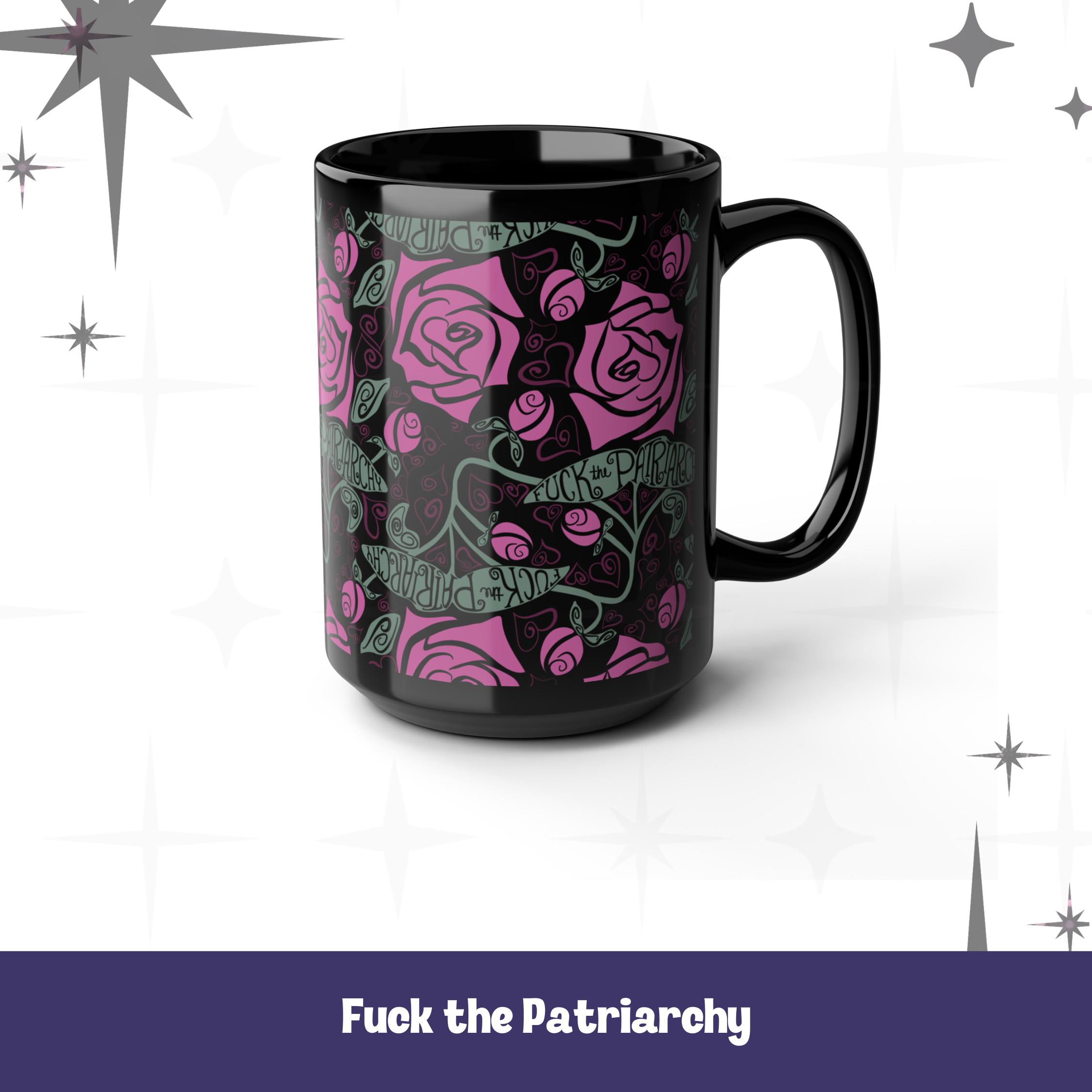 - FUCK Patriarchy black base; bright pink roses, mulberry hearts, & green leaves