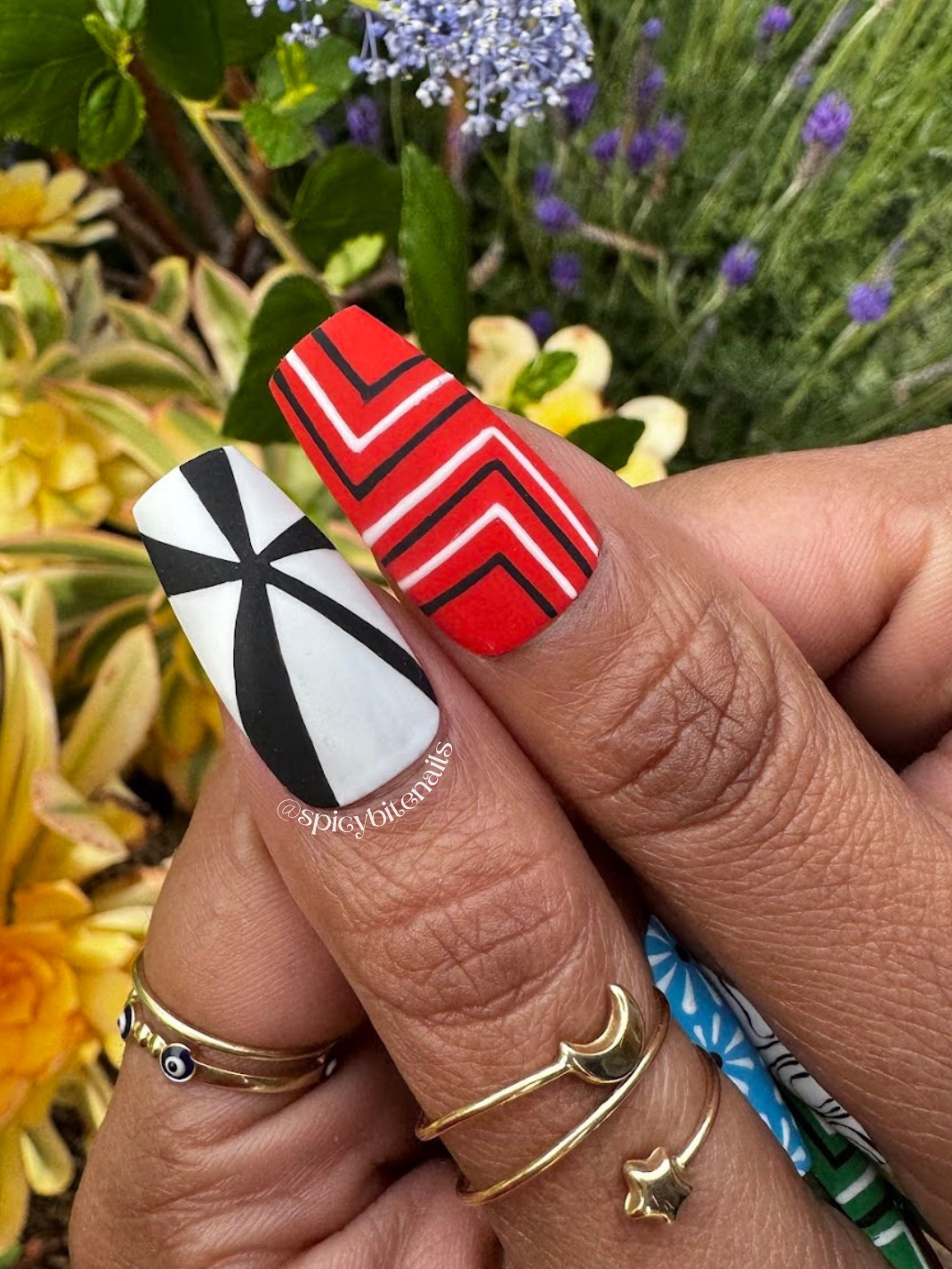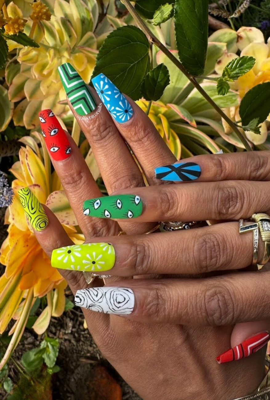 Bold Type is a vibrant press-on nail set that celebrates playful pattern and unapologetic color. Featuring a dynamic mix of graphic florals, abstract eyes, wavy lines, and retro-inspired prints, each nail feels like a piece of pop art. Matte finishes in bold reds, blues, greens, and neons bring the design to life, creating a high-impact look that’s equal parts funky and fearless. Perfect for statement makers, artists at heart, or anyone who loves their nails as expressive as their style.