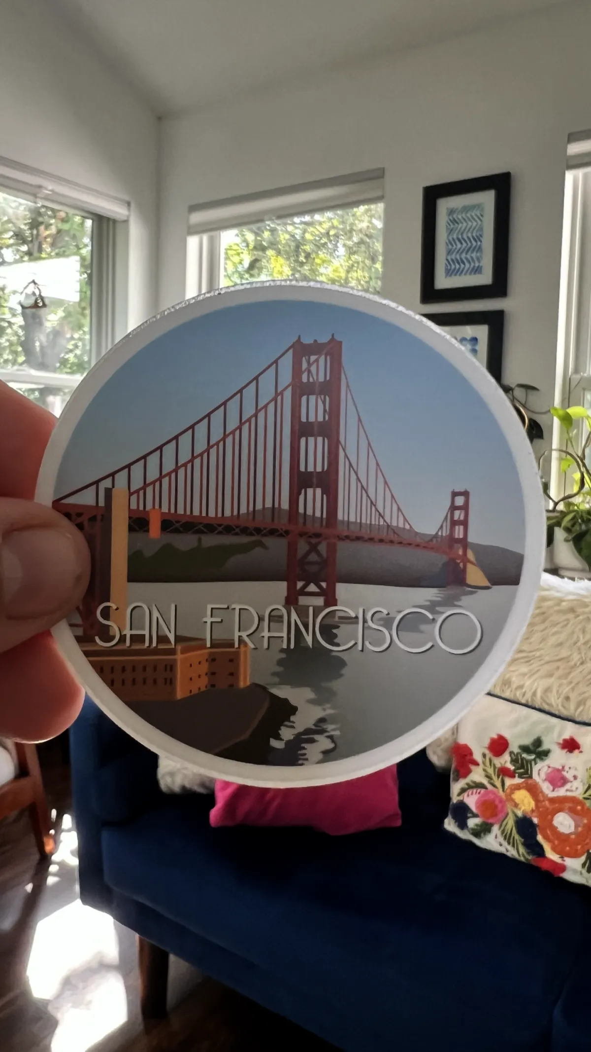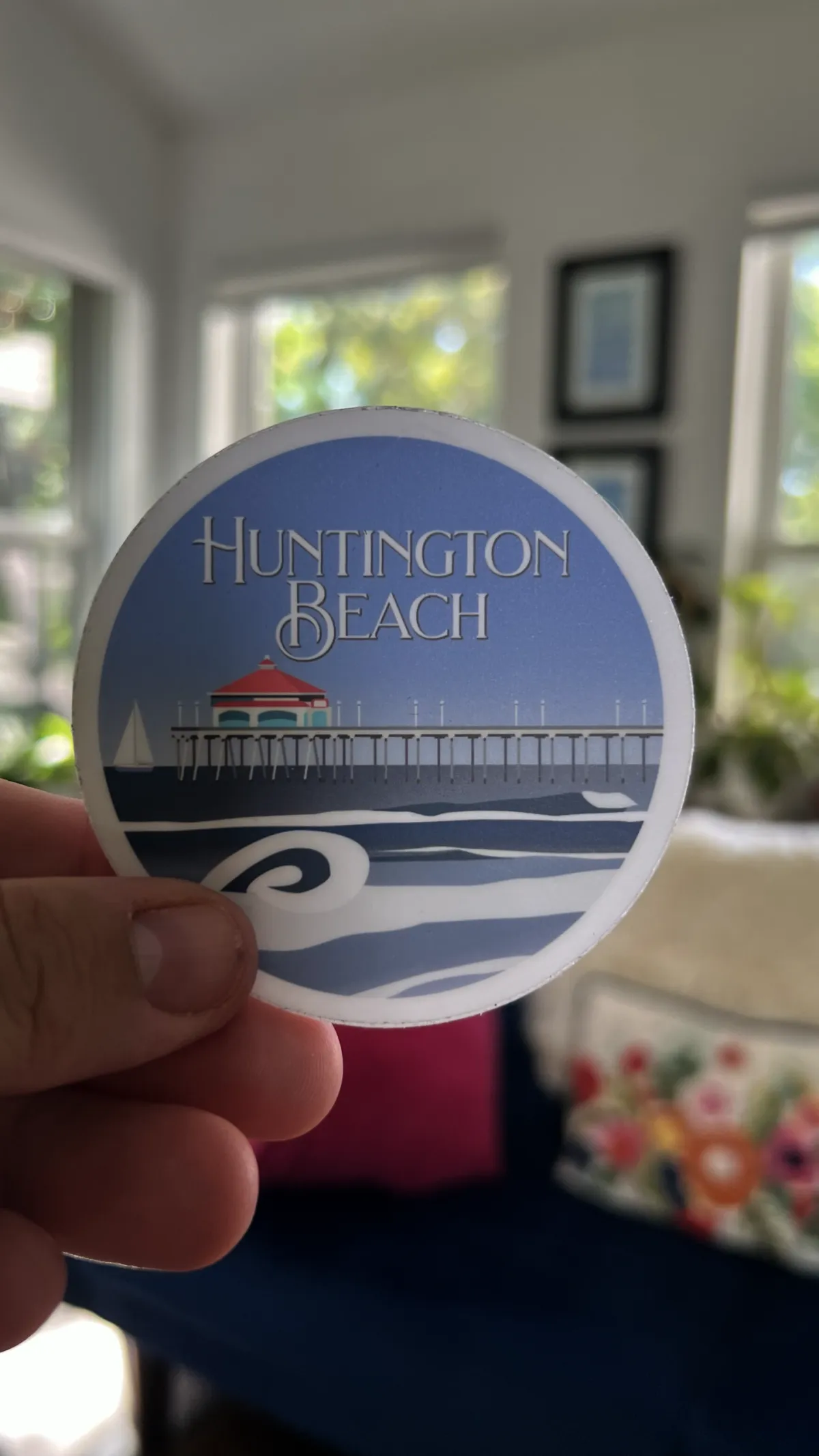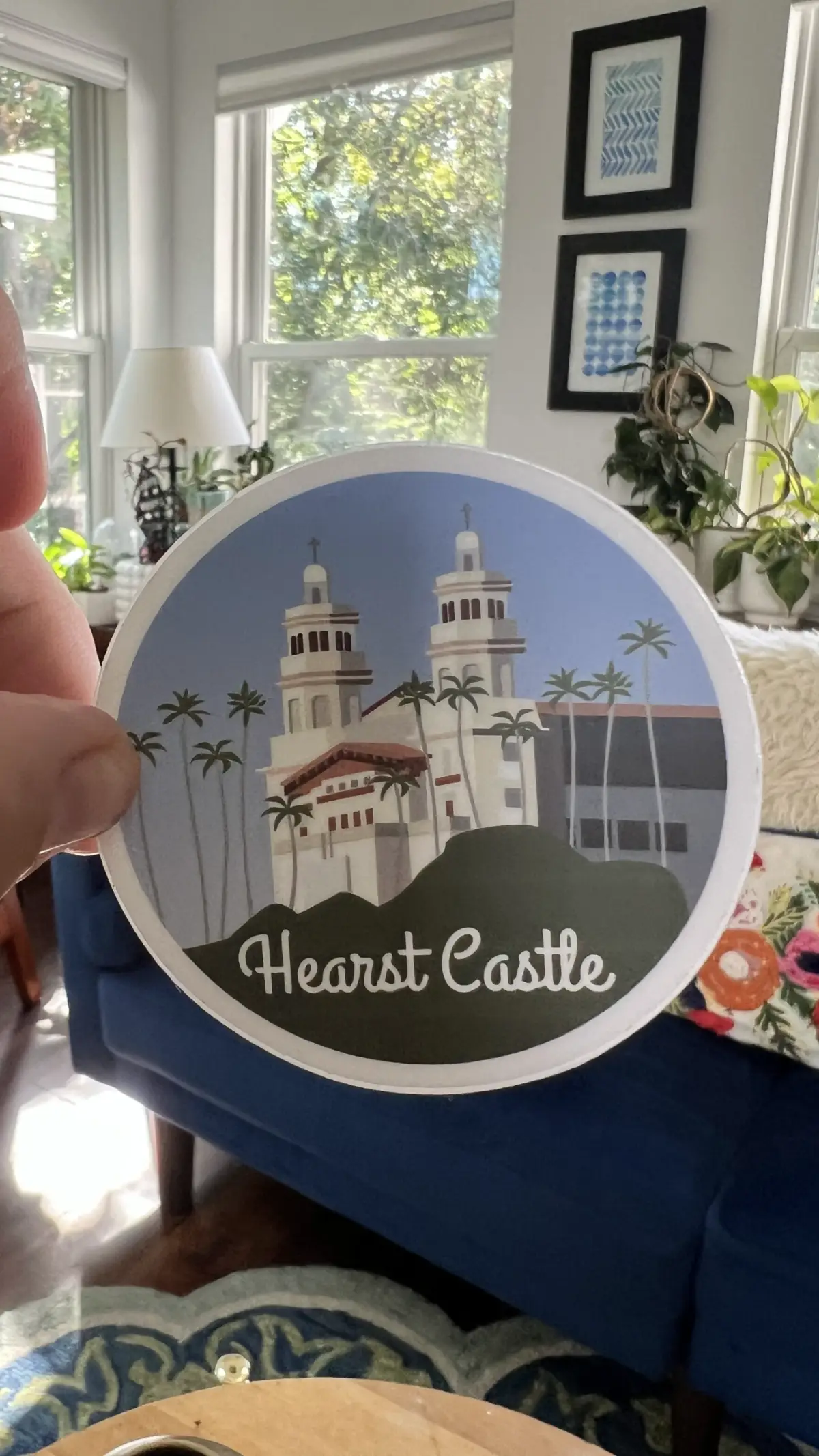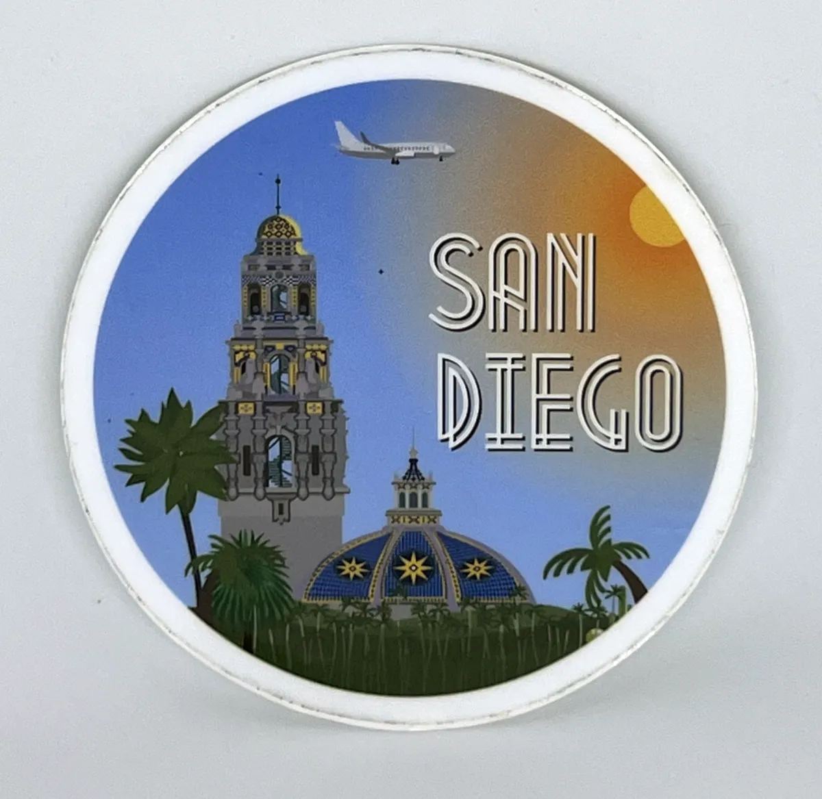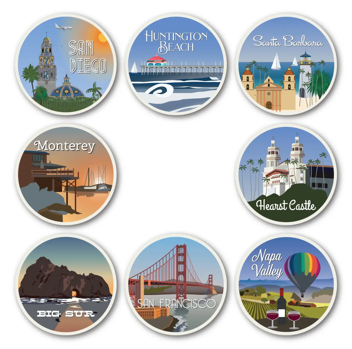 California illustrated sticker collection. Eight 3”x3” round vinyl collectible sticker. Stickers include the San Diego, Huntington Beach, Santa Barbara, Monterey, Big Sur, Hearst Castle, Napa Valley, and San Francisco.