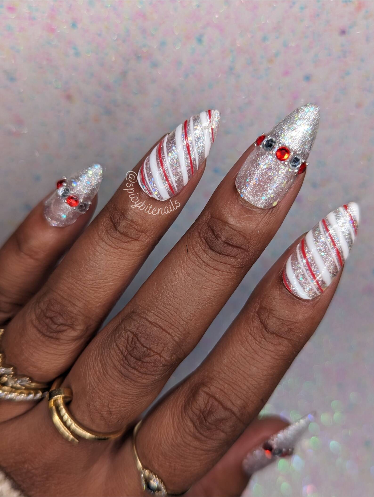 What’s more Christmas than candy cane nails? These sparkly but classy nails feature a white iridescent shimmer and white and red candy cane stripes with red and silver rhinestones on alternating nails.