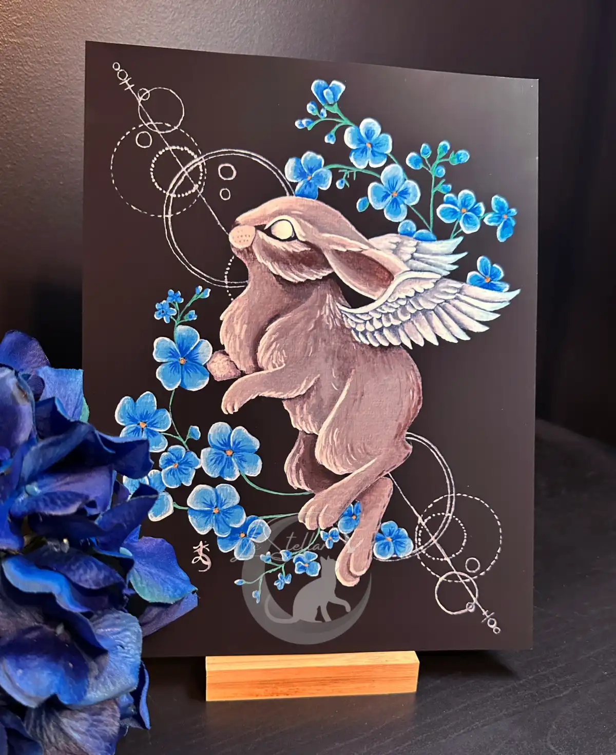 Celestial Hare Hand-painted Art Print, Winged Angel Bunny with Forget-Me-Nots, Dark Fantasy Animal Decor