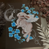 Celestial Hare was born from love and remembrance. A winged rabbit drifting through constellations of blue forget-me-nots. Painted originally in acrylic on a wooden 5×7 canvas, this piece blends celestial geometry with soft fur and tender light, balancing the ethereal and the earthly.