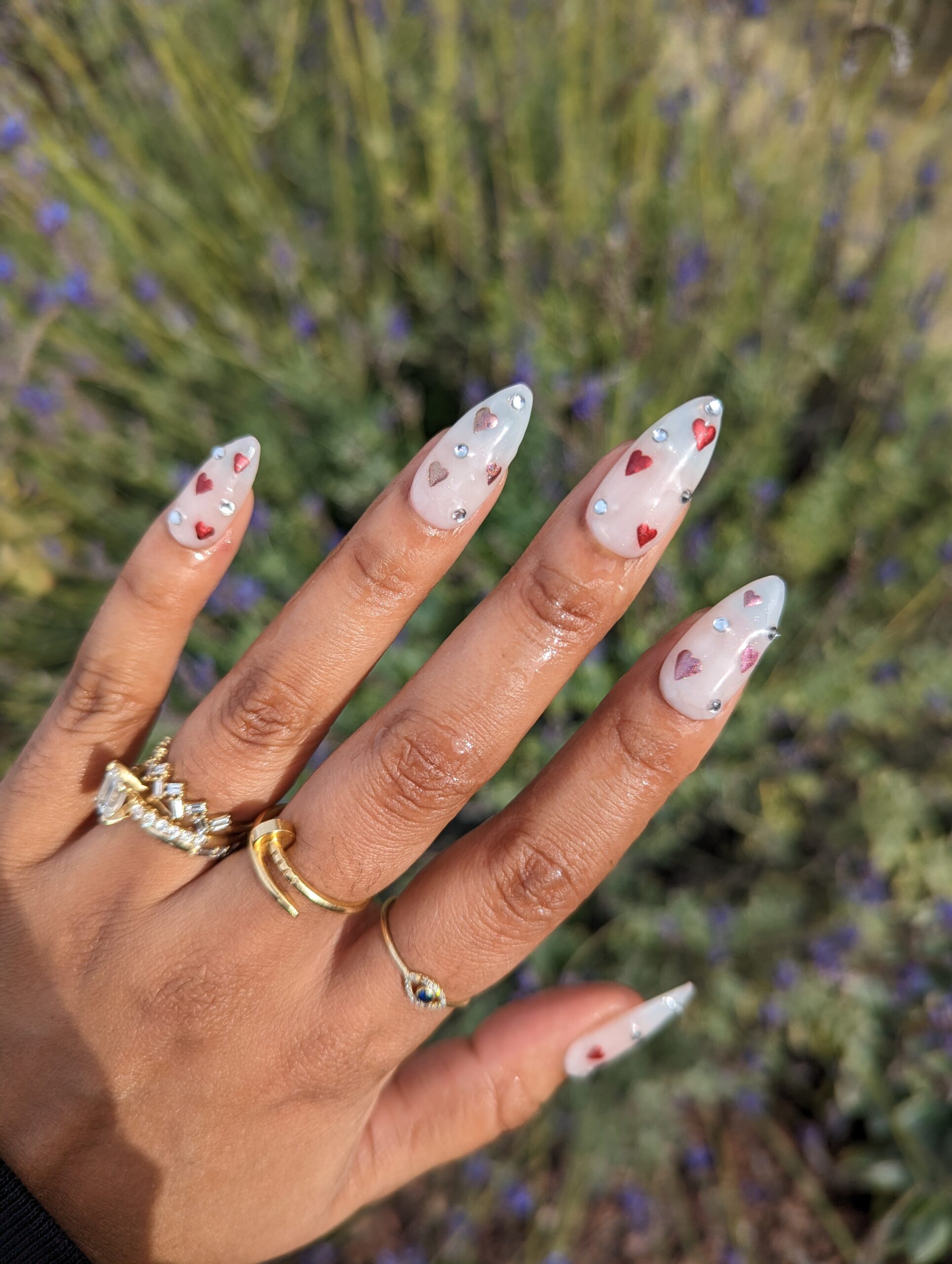 Wear your heart on your nails with these pretty red and pink chrome hearts over a light pink to white color changing polish. Also, they have some rhinestones because why not?