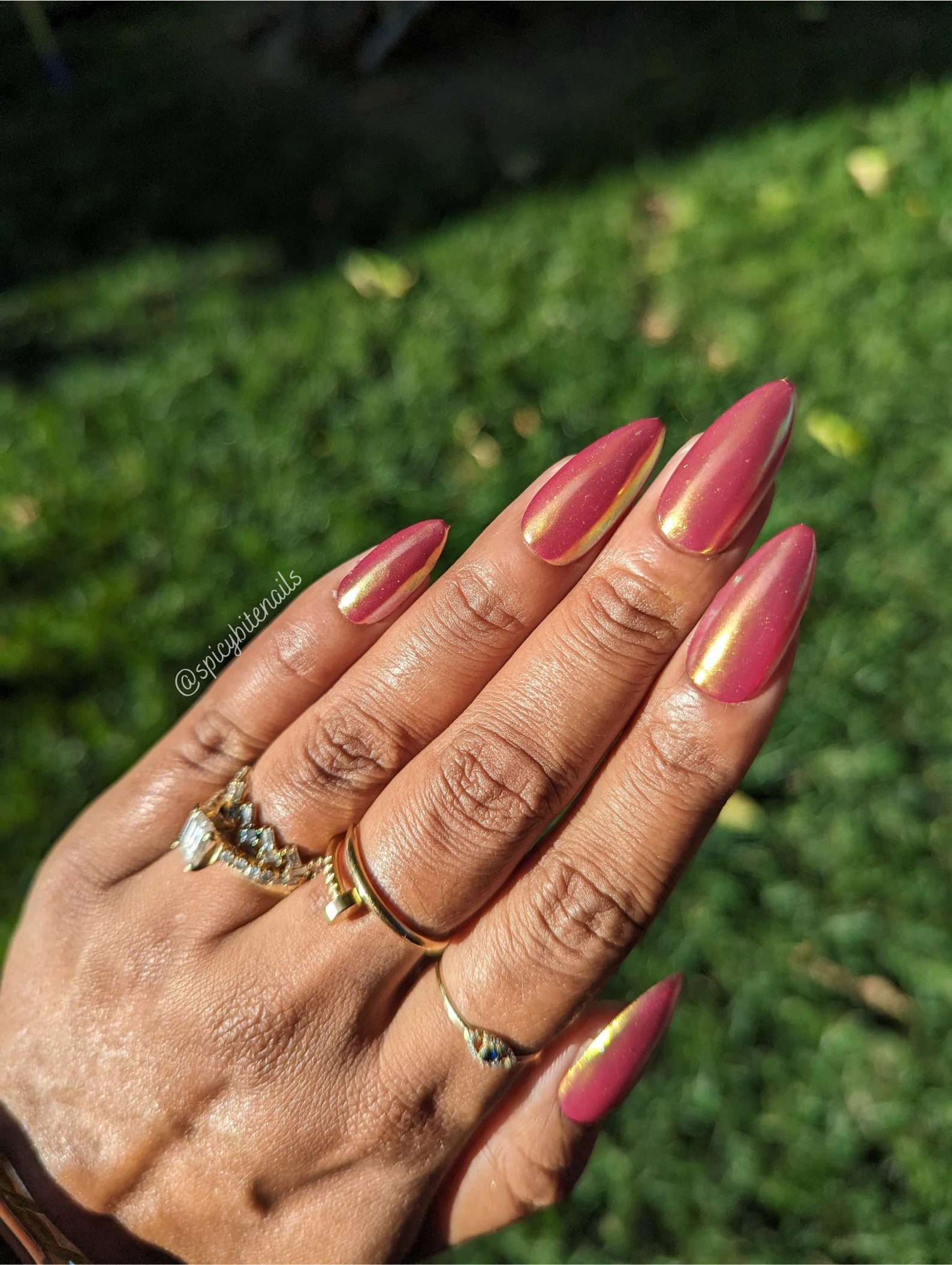 A fun, fall twist on the classic Glazed Donut Nails. You know these nails — you’ve seen them on Instagram, you’ve seen them on Hailey Bieber, now it’s time to see them on you, this time in burgundy! A beautiful throwback to the early 2000s with a burgundy base covered in a pearly/golden chrome powder. A classic!