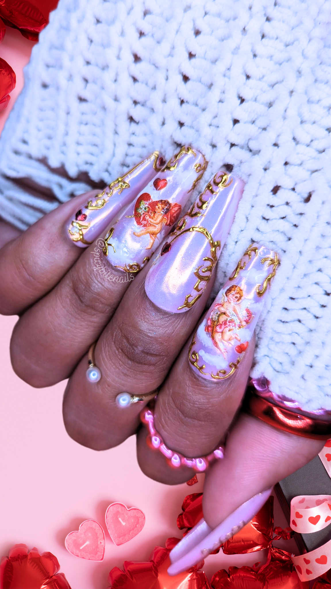 William Shakespeare said “You are a lover. Borrow Cupid’s wings and soar with them above a common bound.” These nails are baby pink covered in a unicorn aurora chrome powder with Baroque gold details and dainty little Cupid angels and hearts, you’ll definitely fall in love with these nails.