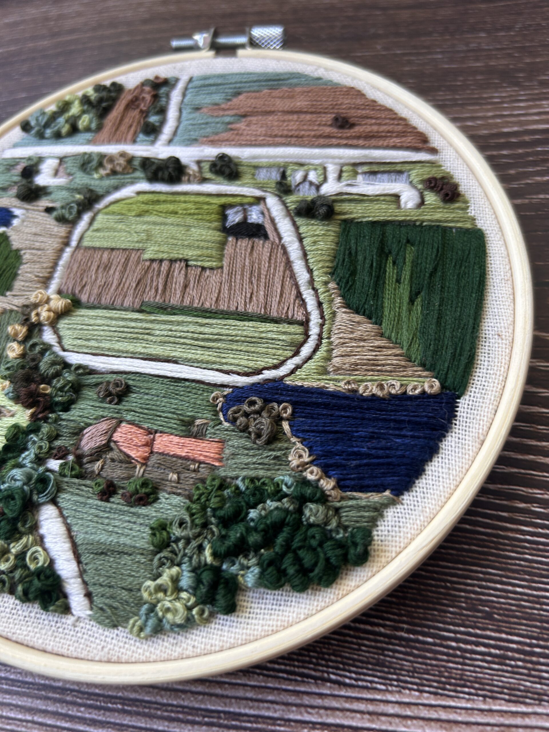 Now offering custom aerial embroidery. If you have a meaningful place, a favorite view, a map that tells a story, send me the photo and I’ll turn it into stitches. Roads, fields, trees, tiny details, all lovingly obsessively embroidered by hand 🧵🌍