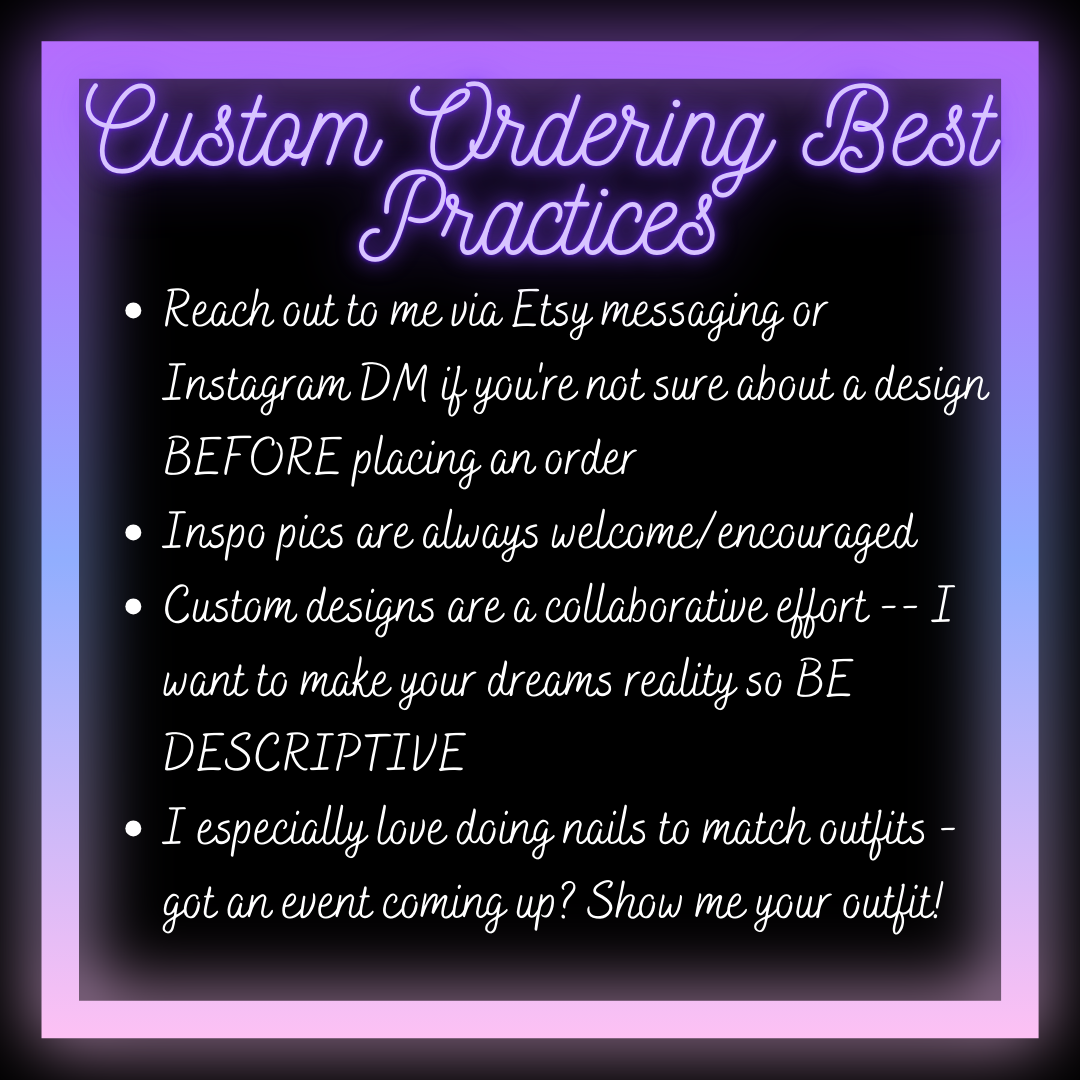 Do you love a design but would like different colors? Do you have a wild idea you’ve always wanted to try? Use this listing to make a custom order of nails designed exclusively for you!