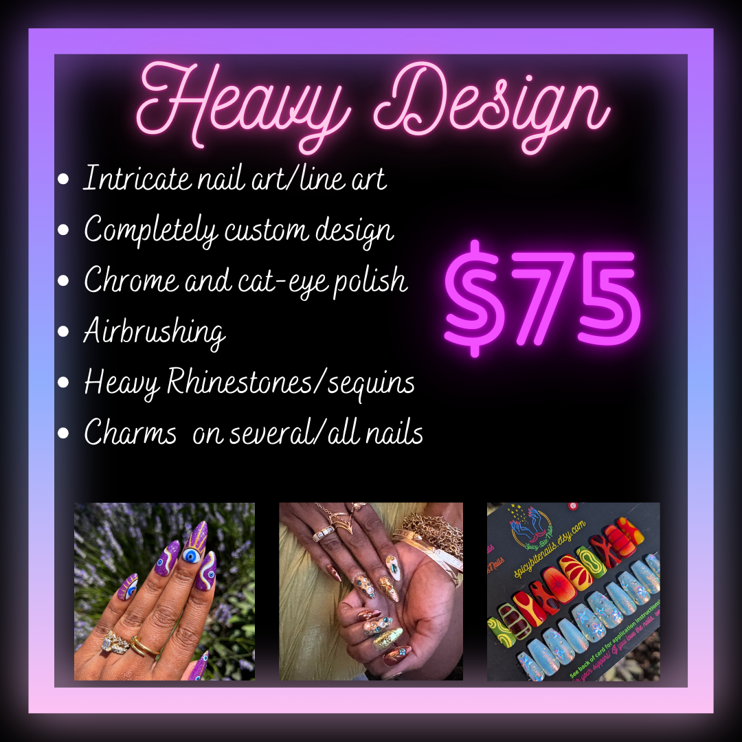 Heavy designs include more than 1 color and designs on all nails including stickers, rhinestones, foils, ombre etc.