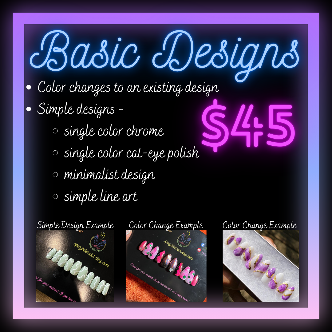 Basic designs include just 1 color with a simple design on 1 accent nail