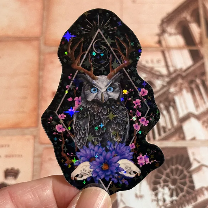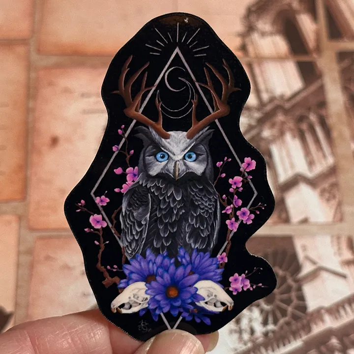 Dark Fantasy Owl Art Vinyl Sticker: Floral Horned Animal Decal, Original Hand-Painted Art