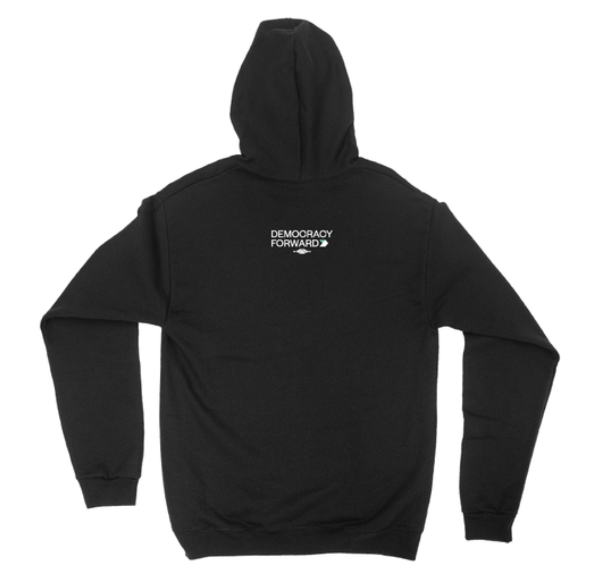 “No Dictators, No Kings” black pullover hoodie with Democracy Forward logo back print.