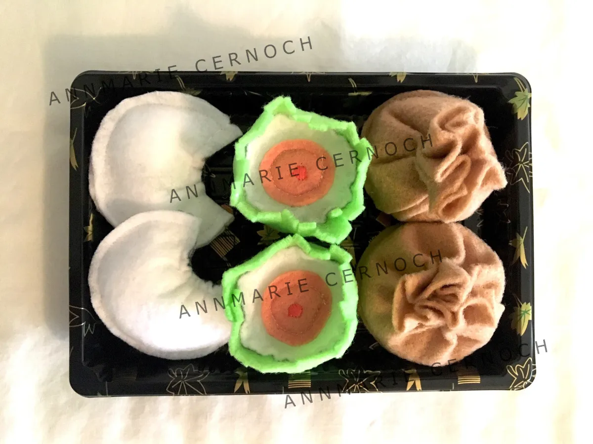 Toys are packaged in a traditional sushi take out box (packaging is getting hard to find, so it may vary slightly from pictures).