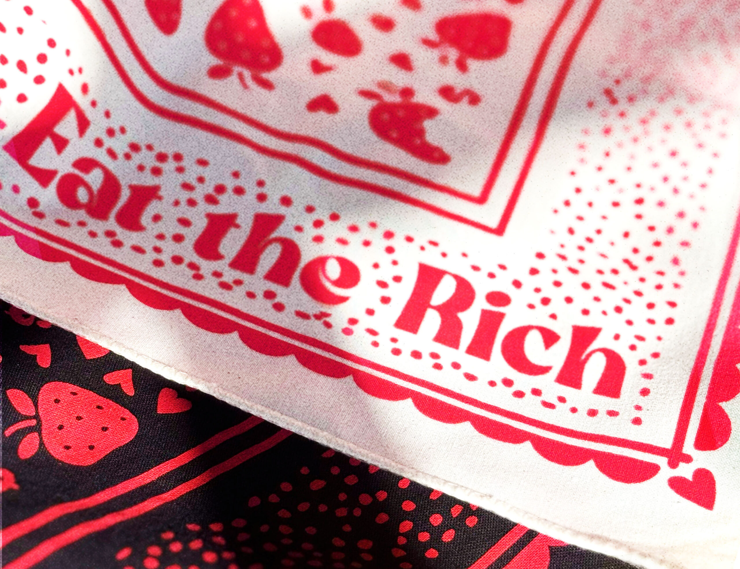 As the saying goes, “When the people shall have nothing more to eat, they will eat the rich.” This bandana juxtaposes the fatal phrase with sweet red strawberries & dollar signs. Polka dots line the border to create an unassuming appearance that disguises the bite of the message.