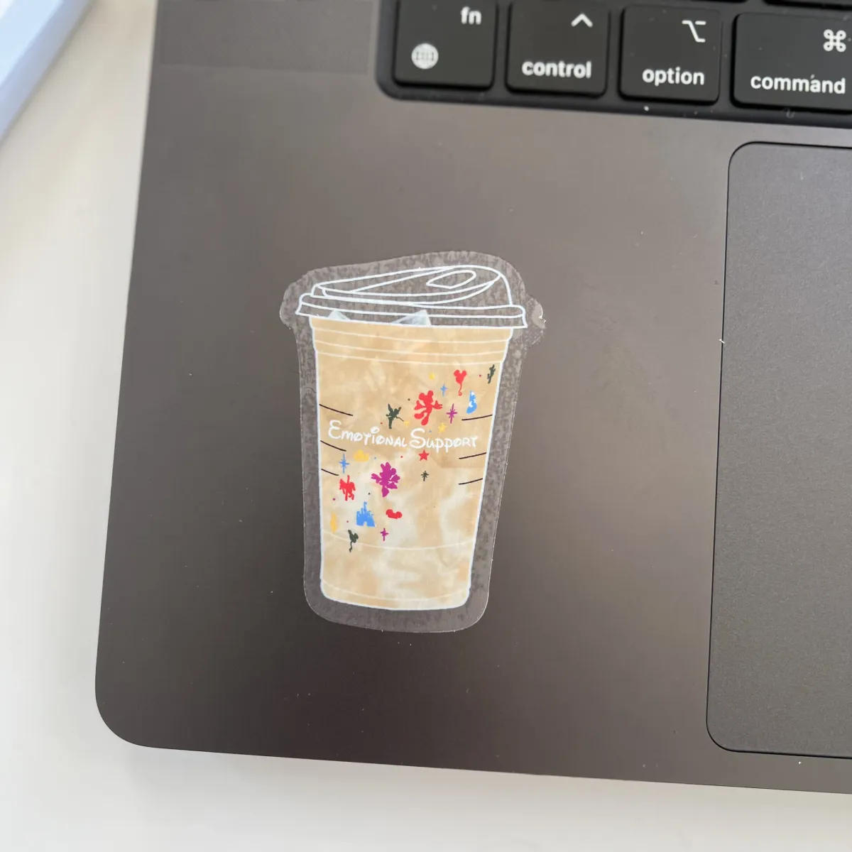 Sticker is hand-drawn by Rachel of Lemon Press Studio, featuring an illustration of an iced coffee in a Disney Starbucks to-go cup with ice cubes, and the words “emotional support” in the style of Disney. Printed on clear vinyl.