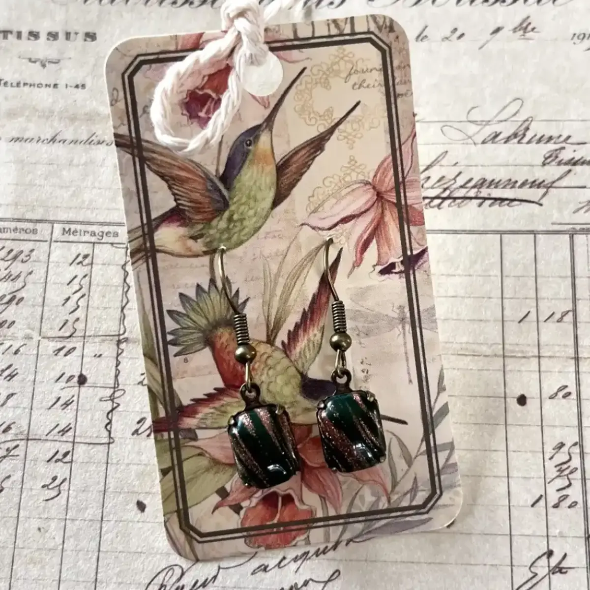 Dangle earrings measuring approximately 1 1/16 inches in length, featuring genuine vintage West German dark forest green octagon glass stones with subtle goldfluss accents. The forest green is so deep that to some eyes it almost appears black. Set in antiqued brass and finished with antiqued brass French hook earwires, they’re lightweight, moody, and richly dimensional.