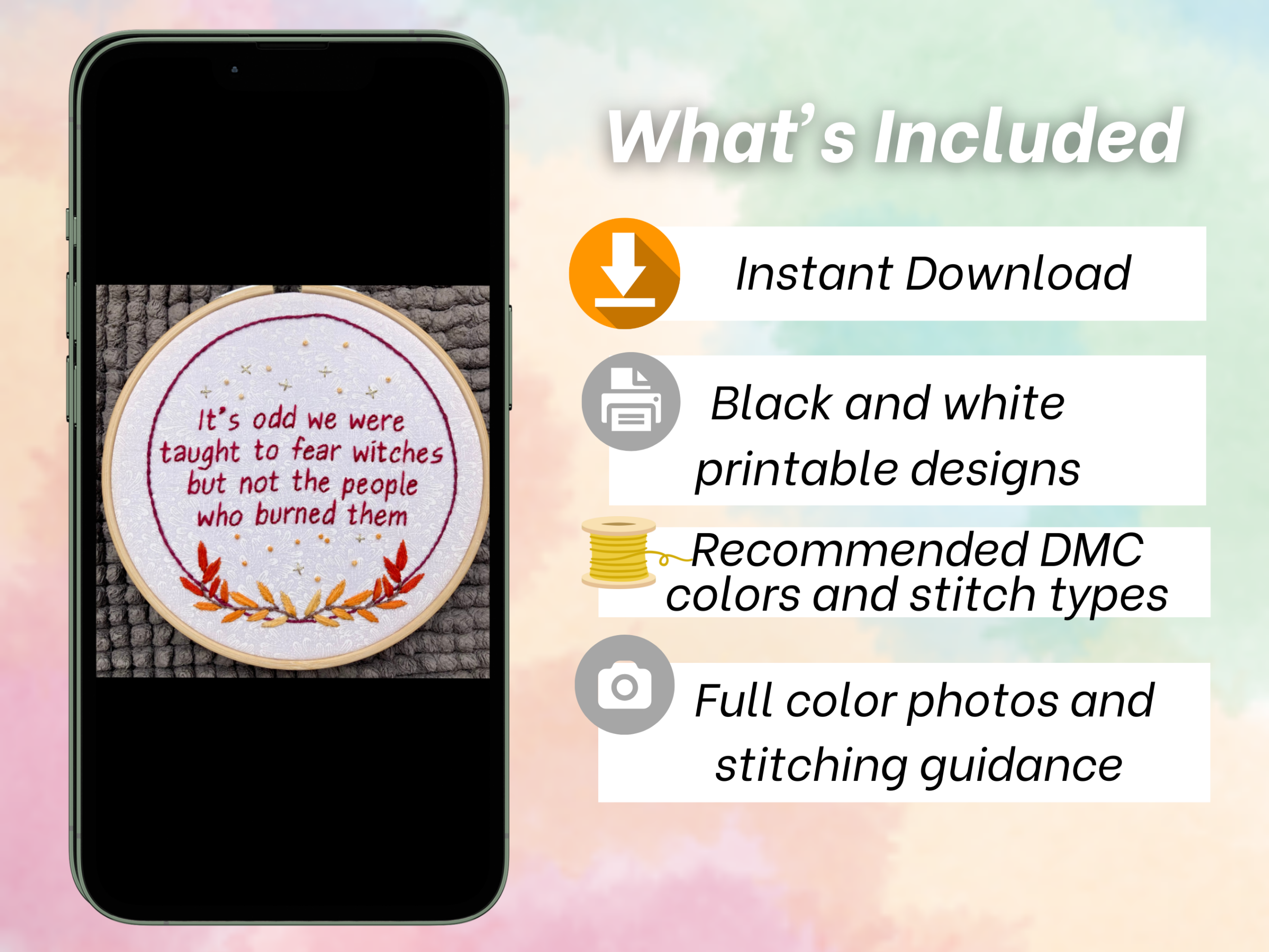 Feminist Witch Hand Embroidery Pattern: Snarky Quote, Fire Wreath (PDF Digital Download)