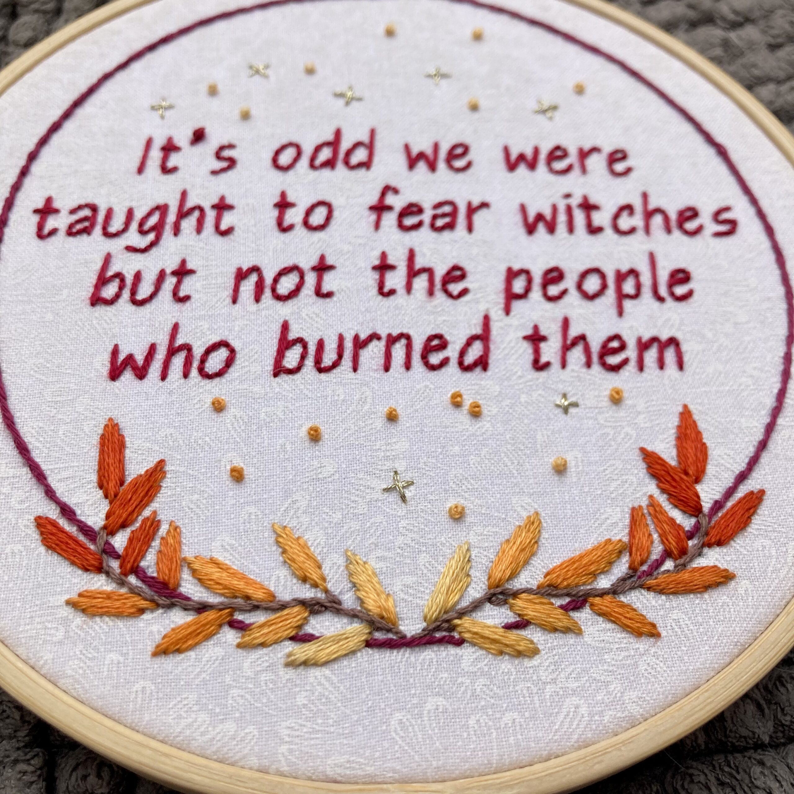 “It’s odd we were taught to fear witches but not the people who burned them.” This thought provoking quote is perfect for similarly snarky / sassy / smart / edgy / feminist / witchy / fed up / proud / thoughtful people in your life! And yourself, of course. I chose a strong darker red thread for the quote and surrounded it with a wreath of leaves colored to evoke fire. The color gradation is easy to achieve with variegated thread. Plus gold sparks and embers because shiny sparkles help. Perfect for Halloween and spooky season, but, really, welcome in my home all year round.
