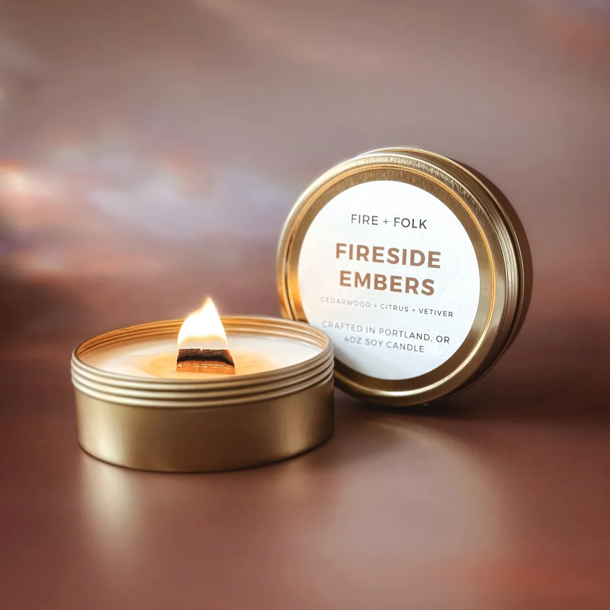 FIRESIDE EMBERS |4oz pure soy candle tin with wood wick