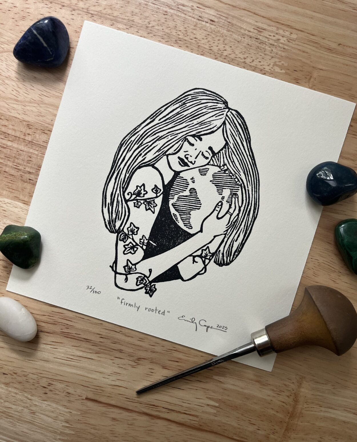 It was made by carving the design out of a linoleum block and hand printing the edition using oil based ink on acid-free paper. It is a limited edition of 100 prints. Each one comes signed, titled, and numbered. The print measures 6”x6”. Prints will be shipped in a rigid mailer with backing board.