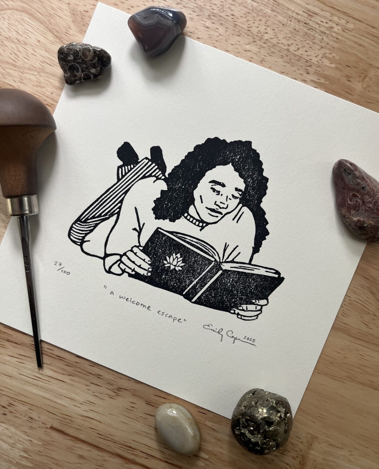“A welcome escape” limited edition linoleum block print – book lovers print, bookish linocut
