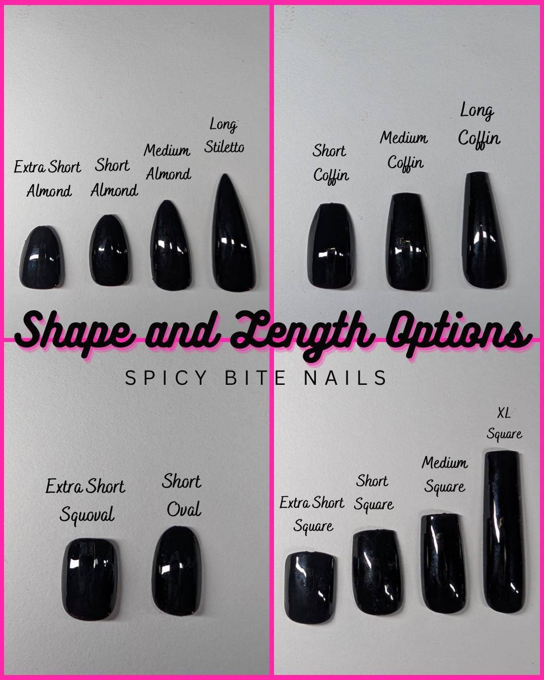 | Shape | Extra Short Almond, Extra Short Squoval, Extra short square, Short square, Medium square, Short Coffin, Medium Coffin, Long Coffin, Short Almond, Medium Almond, Short oval, Extra Long Square, Long Stiletto |
