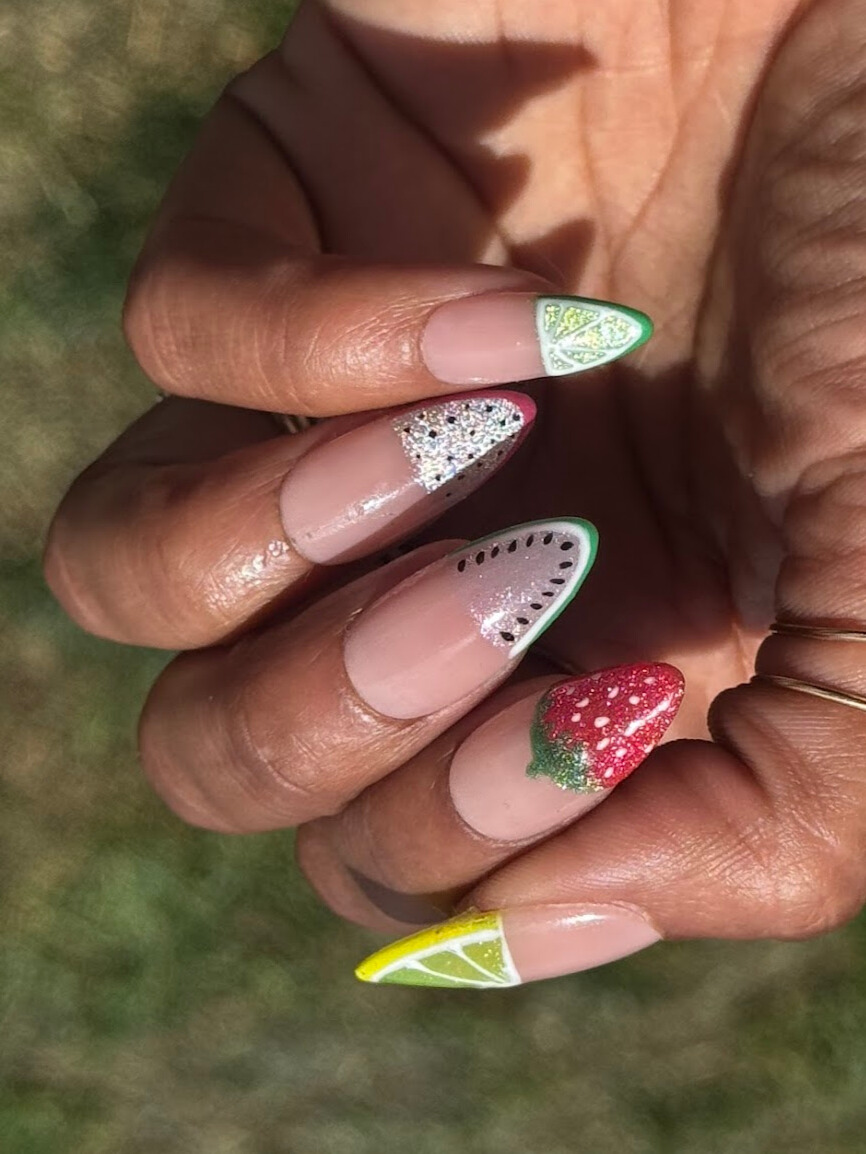 Add a juicy twist to your fingertips with this vibrant fruit-themed press-on nail set! “Fruity Phalanges” features a nude base with sparkling cat-eye shimmer half-French tips, each nail uniquely inspired by your favorite fruits—think zesty orange slices, tangy lemons, kiwis, strawberries, and glistening watermelon.