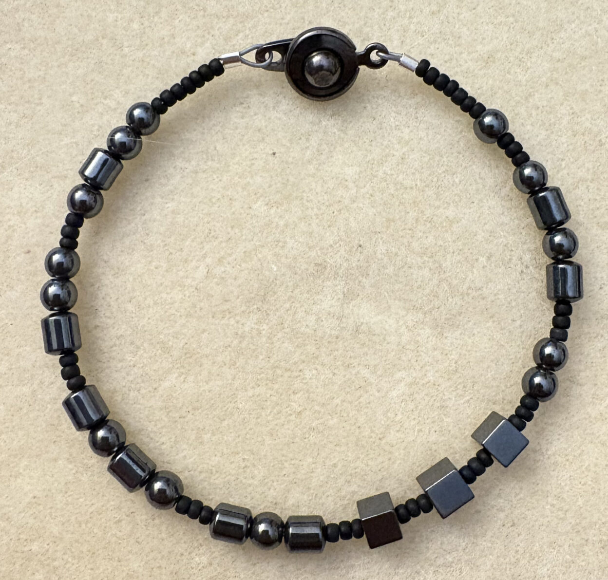 Hematite beads are used to represent dashes and dots, spelling out words and phrases. This bracelet spells out “Fuck ICE”. Bracelet is made with hematite, glass beads, stainless steel and gunmetal plated brass findings.