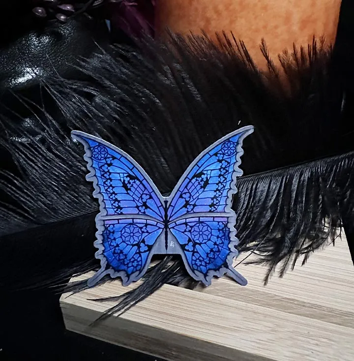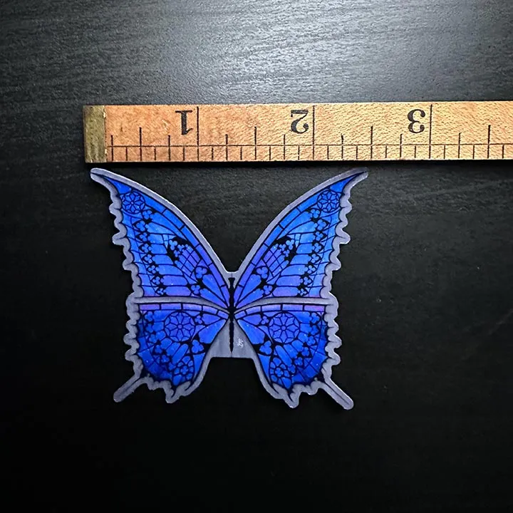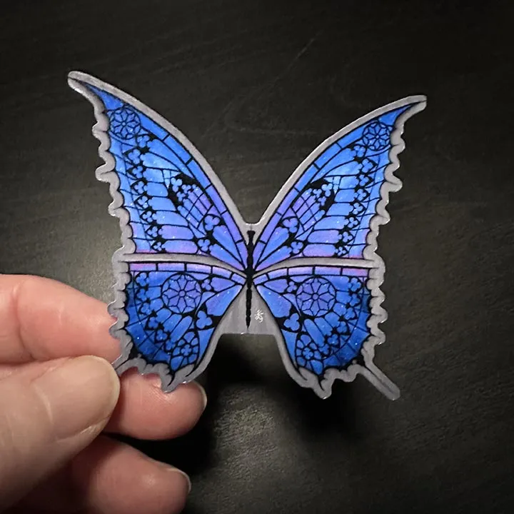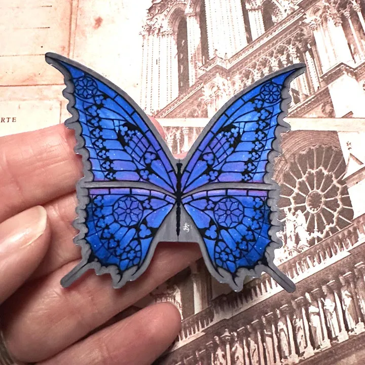 Galaxy gothic cathedral butterfly sticker. This sticker is digitized from the original acrylic painting of half a butterfly. I duplicated the image to form an entire butterfly for an amazing sticker to use on your laptop, water bottle or anywhere else that you like to put stickers. Each sticker is printed on high-quality glossy vinyl and finished with a clear laminate. This sticker is 2.5 inches wide and 2.25 tall, but if you would like a different size feel free to reach out to me using the “custom request” option.