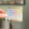 Sticker is designed and hand-lettered by Rachel of Lemon Press Studio and features the quote, “girls just wanna have fundamental human rights” in a holographic finish on a white background. “girls just wanna have fun” is in a block font with a vibrant holographic finish. “damental human rights” is hand-lettered in a modern calligraphy style with a slightly muted holographic finish