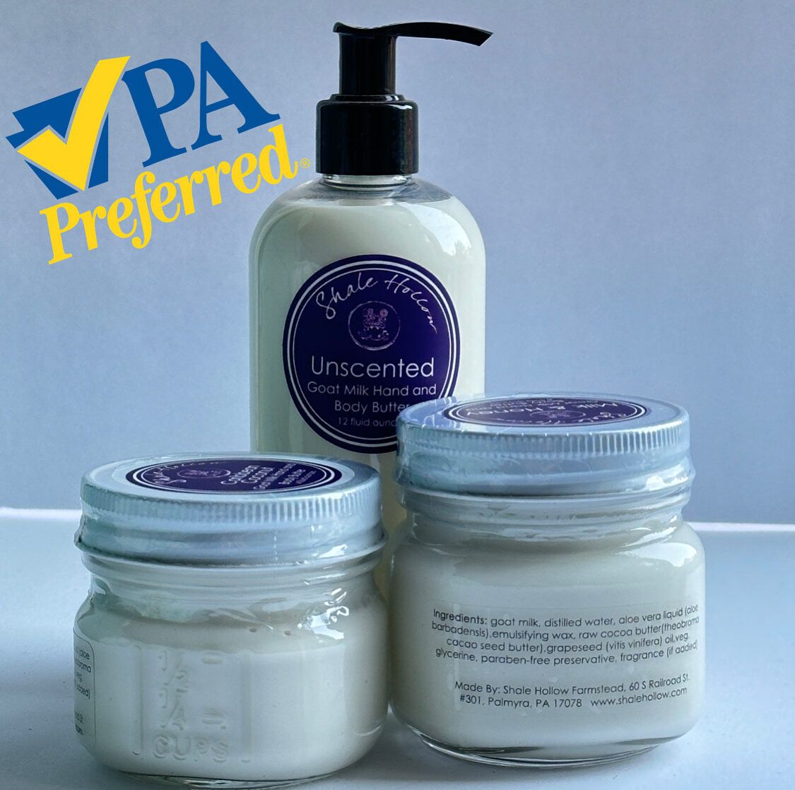 Coconut-free, luxuriously thick body butter (think lotion, but thicker) featuring the raw milk from our dairy goats (currently Annie, Pecan, Maple and Redbud). This small-batch lotion is rich and creamy, providing support for dry skin all over your body. In addition to being coconut-free, this lotion is also paraben-free. It does contain a small amount of preservative (1% of the recipe).