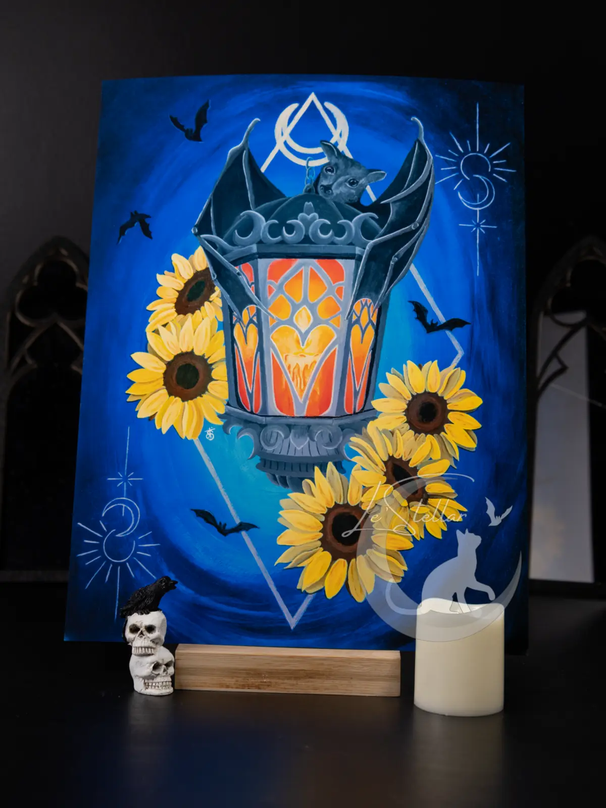 Witchy Lantern and Gothic Bat painting with sunflowers. This piece was a special commission requesting to combine gothic elements with sunflowers. It was originally done on a 12×16 canvas. Prints are available in 8.5×11 and 4×5.