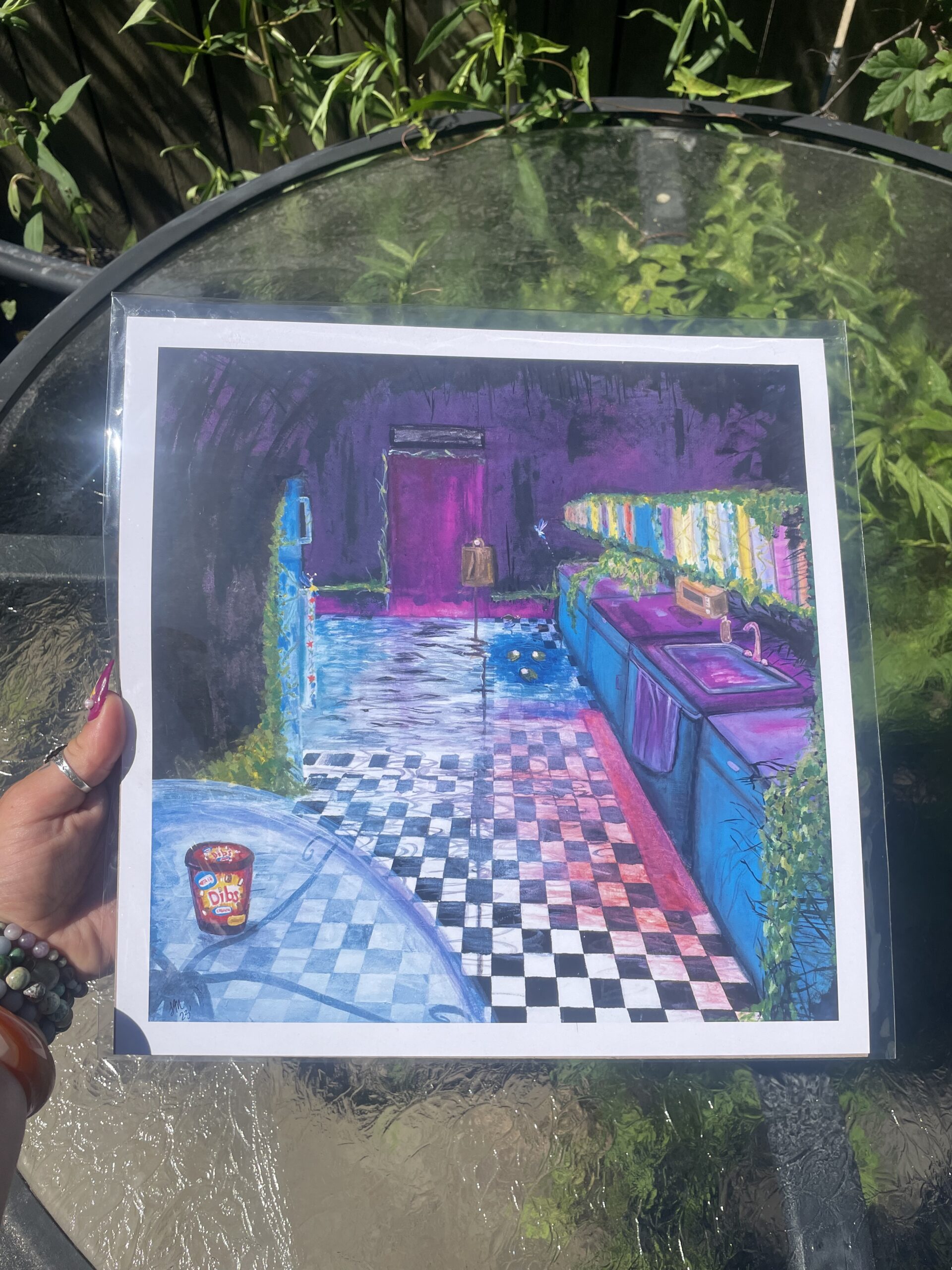 12 x 12 inches print of my artwork including a one inch white border. The original painting was made with acrylic paint, watercolor pencils and pastels in 2023.
