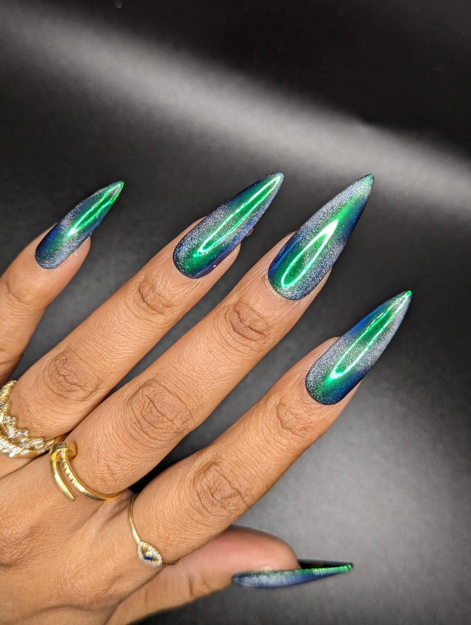 These nails have to be seen to be believed! The coolest blue-green color shifting chrome with an equally mesmerizing holographic swirly cat eye, these nails will leave everyone green with envy.