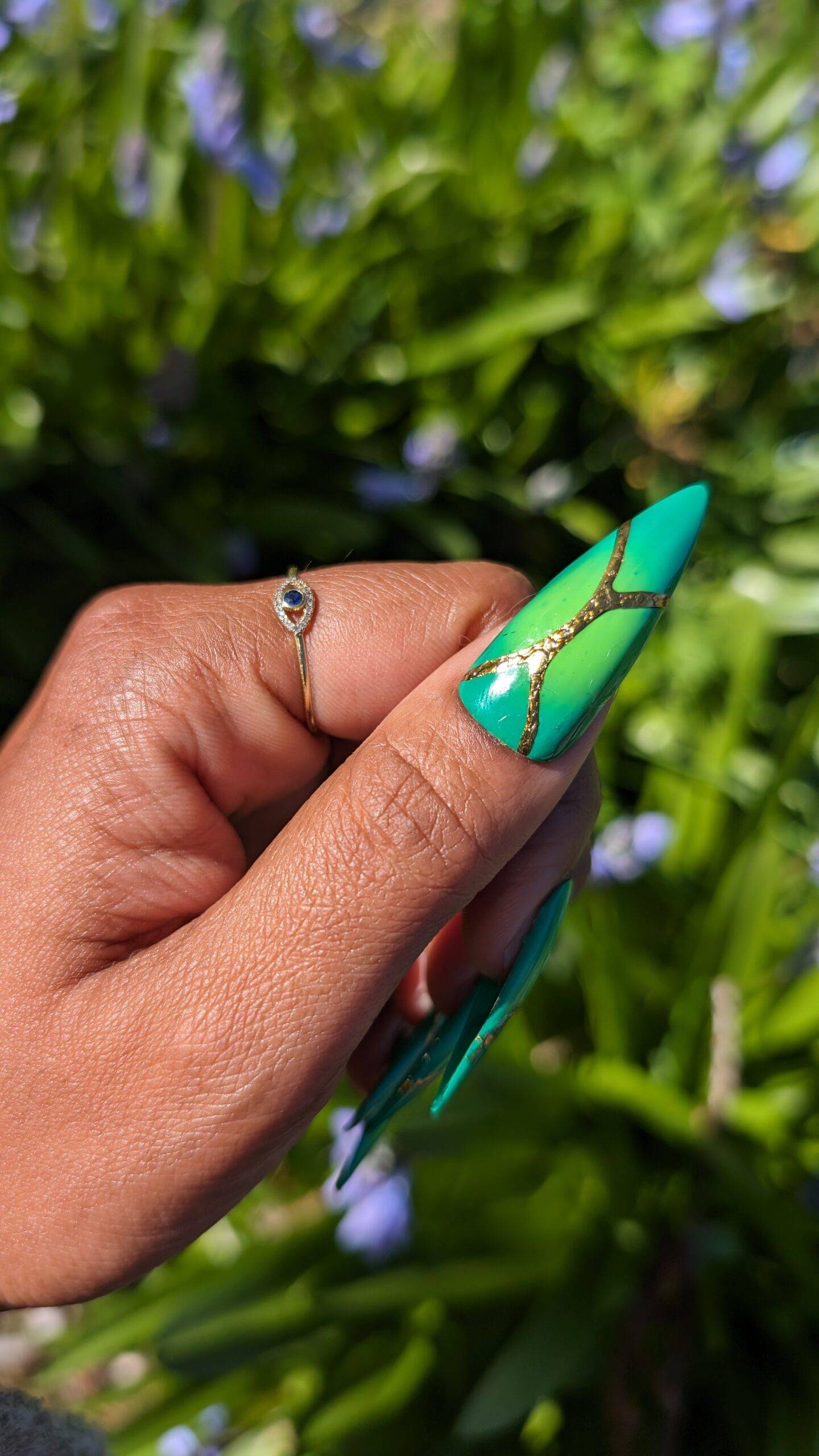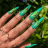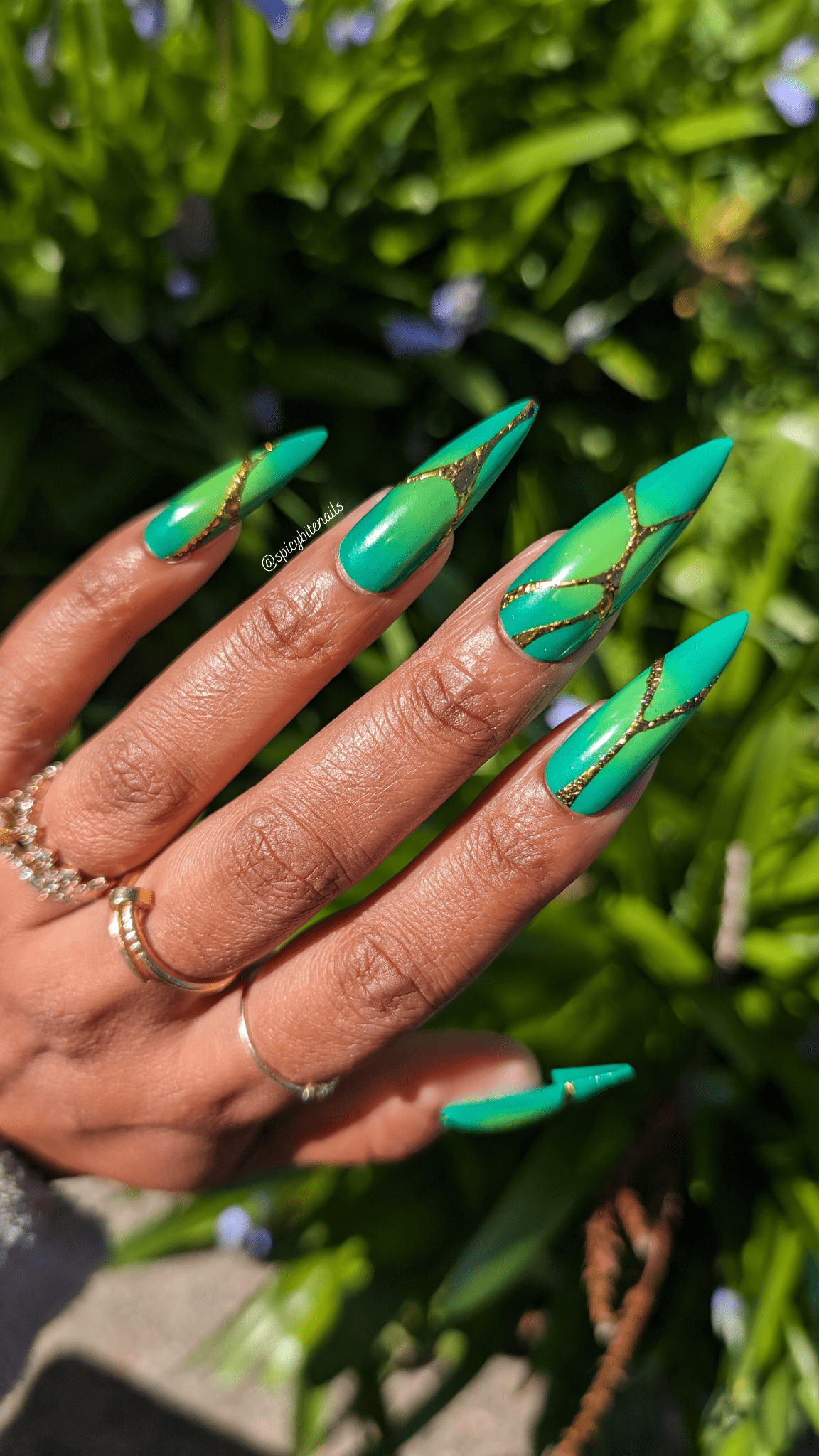 What’s your AOL Screen name? These green aura Y2K nails will have you longing for the days of the year 2000. A kelly green background with a lighter green aura in the middle topped with gold textured chrome Y2K squiggles, you’ll look extra fly while texting on your Sidekick!