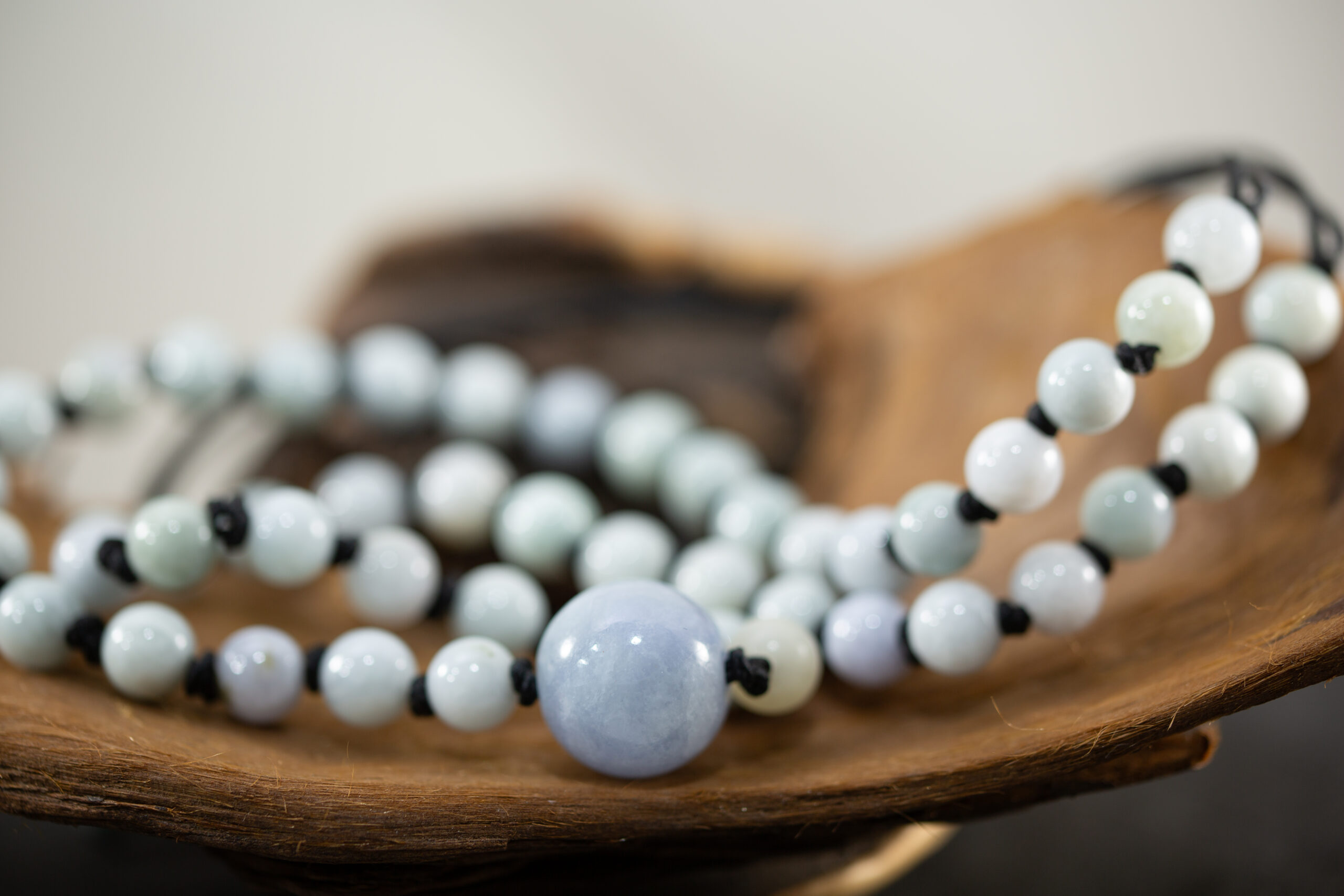 This elegant pendant showcases a rare lilac jadeite bead sourced from the highlands of Guatemala, prized for its soft lavender hues and translucence. It’s complemented by vibrant Burmese jadeite accent beads, creating a harmonious balance of color and texture. Handcrafted with care, this pendant blends two of the world’s most coveted jade sources into a single statement of timeless beauty and cultural connection.