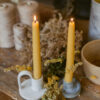 These taper candles are made from raw beeswax that I purchase directly from a local apiary. I take 100% cotton wick and tie weights to each end. I then filter the beeswax through a cheesecloth and carefully dip the wick into a melting pot upwards of around 16 times, letting each pair set between dips. The end product is this pair of 100% clean and beautiful beeswax tapers. No additives, no toxins. Pure beeswax straight from the hive to your home. Candles are packaged in a kraft-style box and tied with twine.