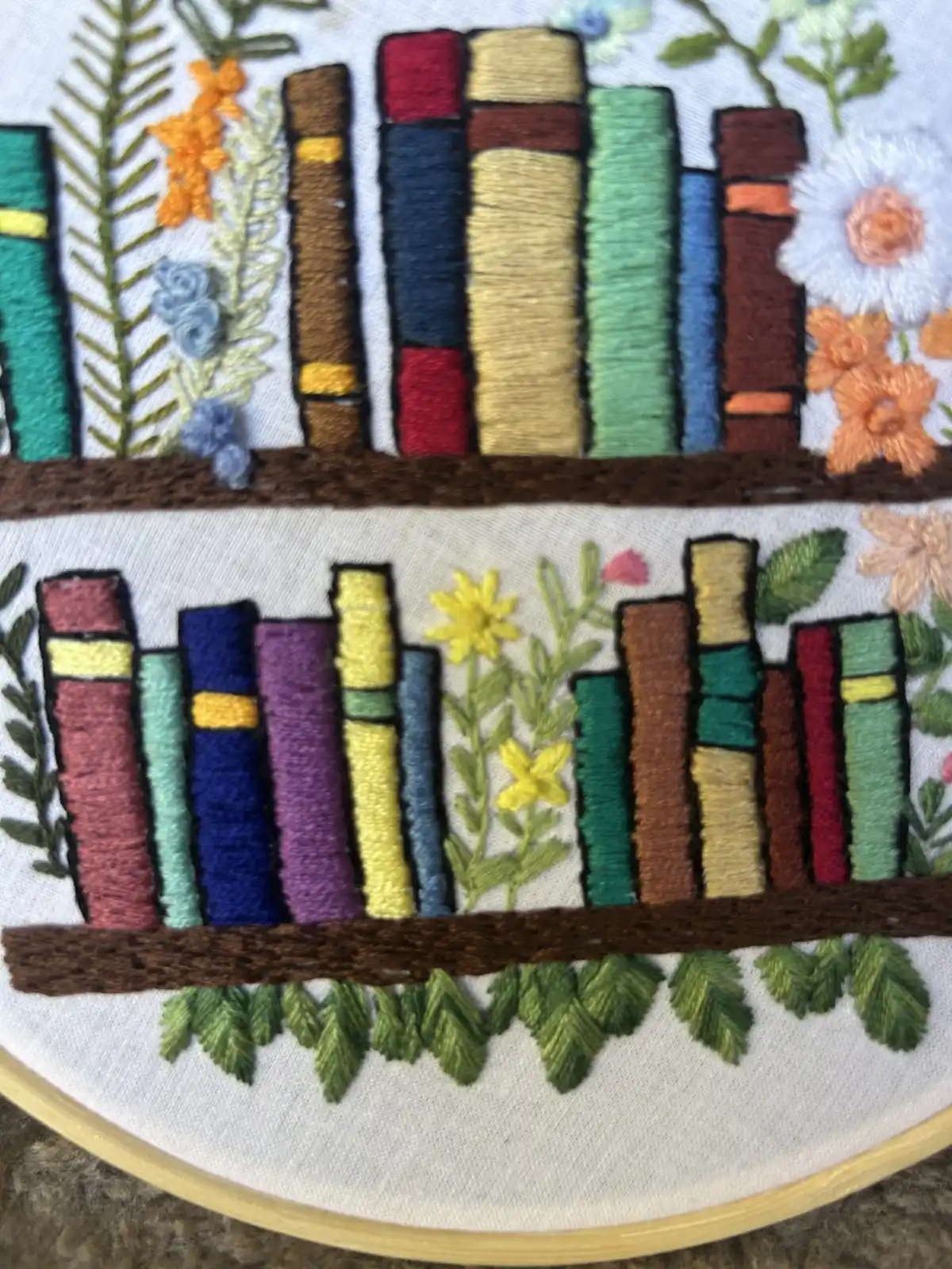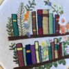 Hand embroidered bookshelf with plants for the bookish and plant lovers.