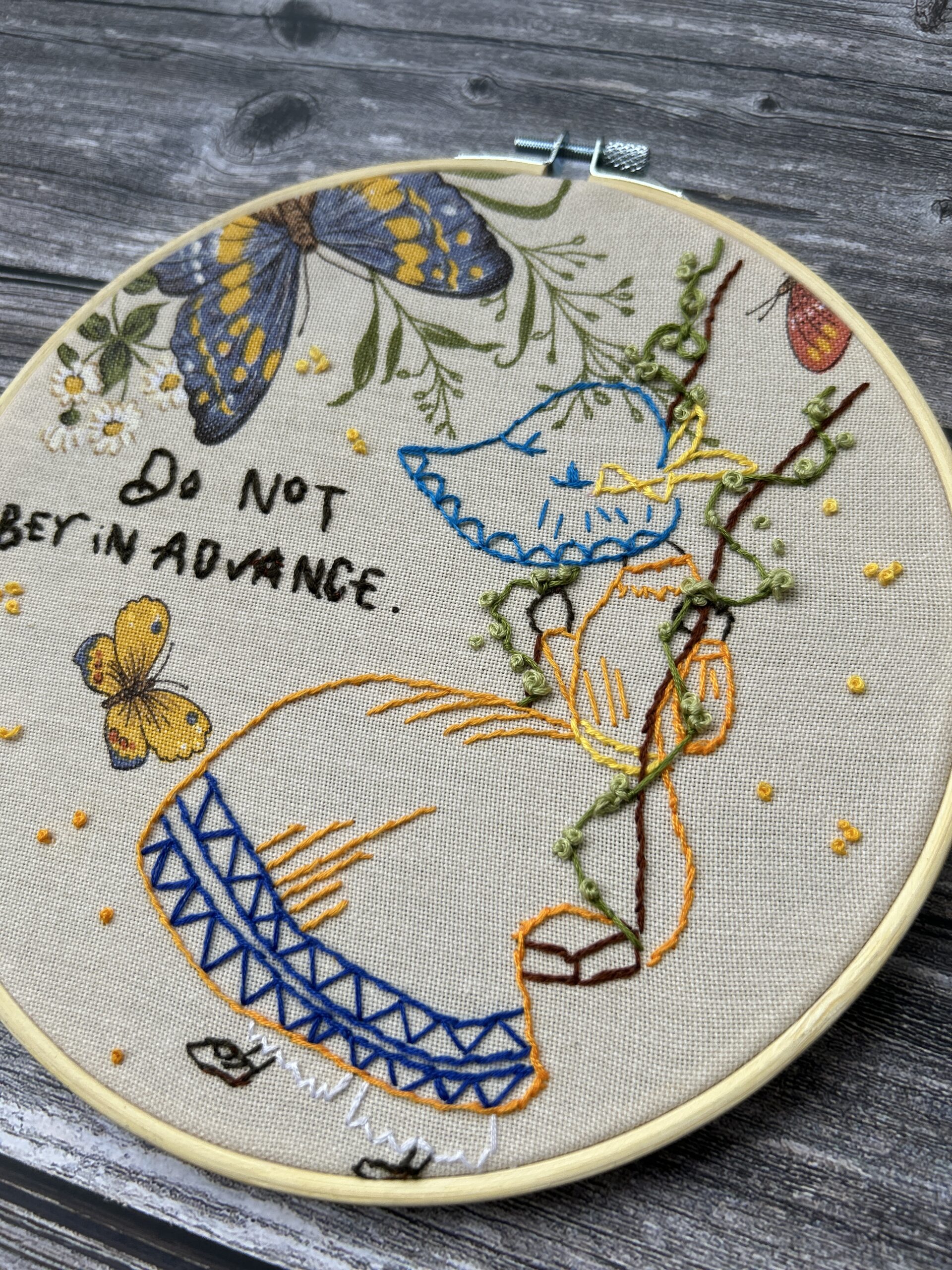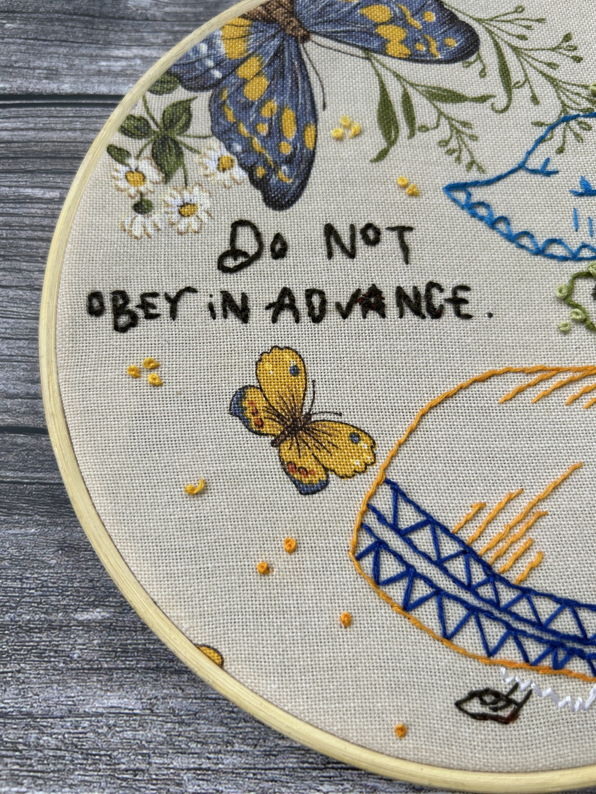 Soft fabric. Sharp message. Respect your elders but also absolutely do not obey in advance. 🦋🧵