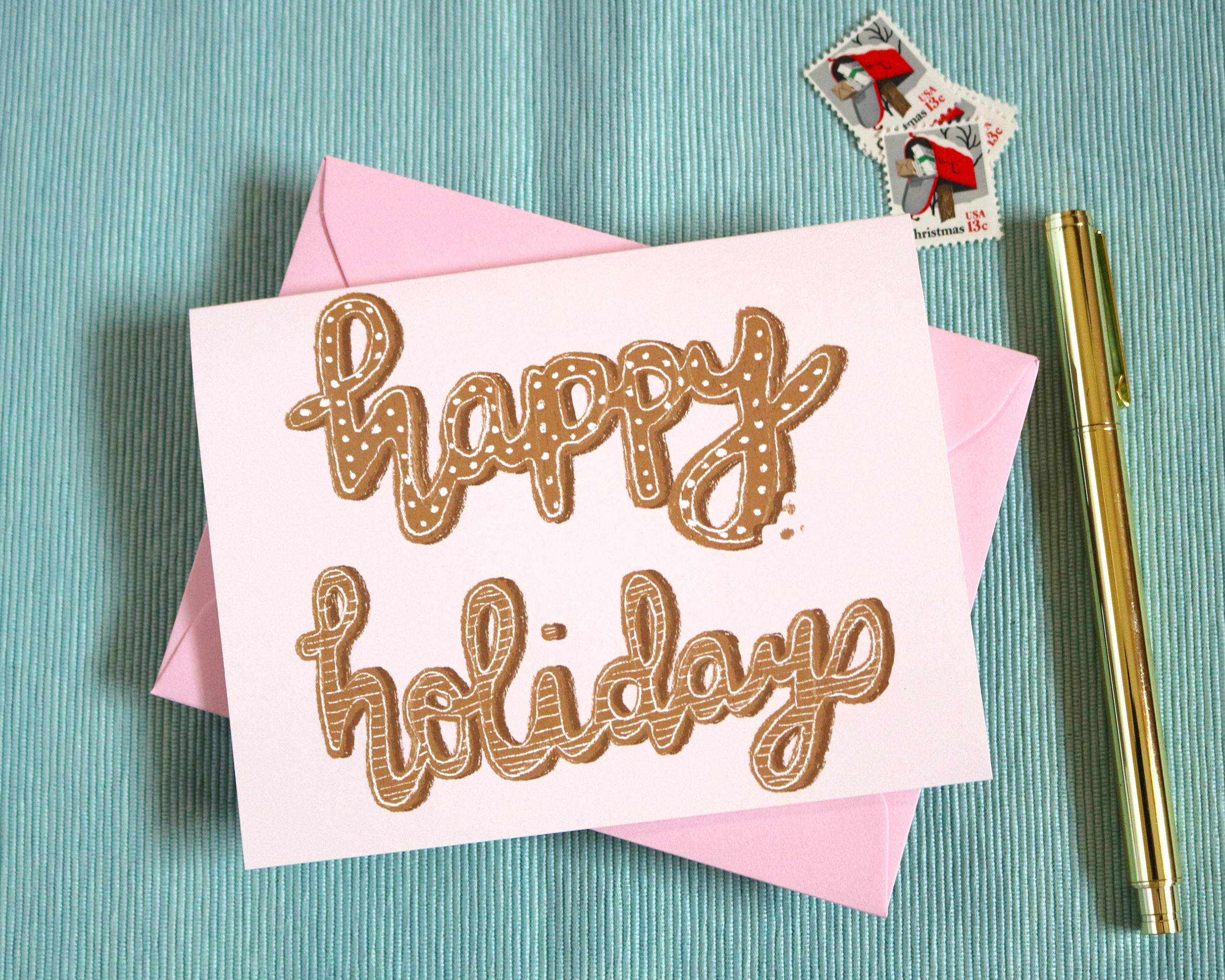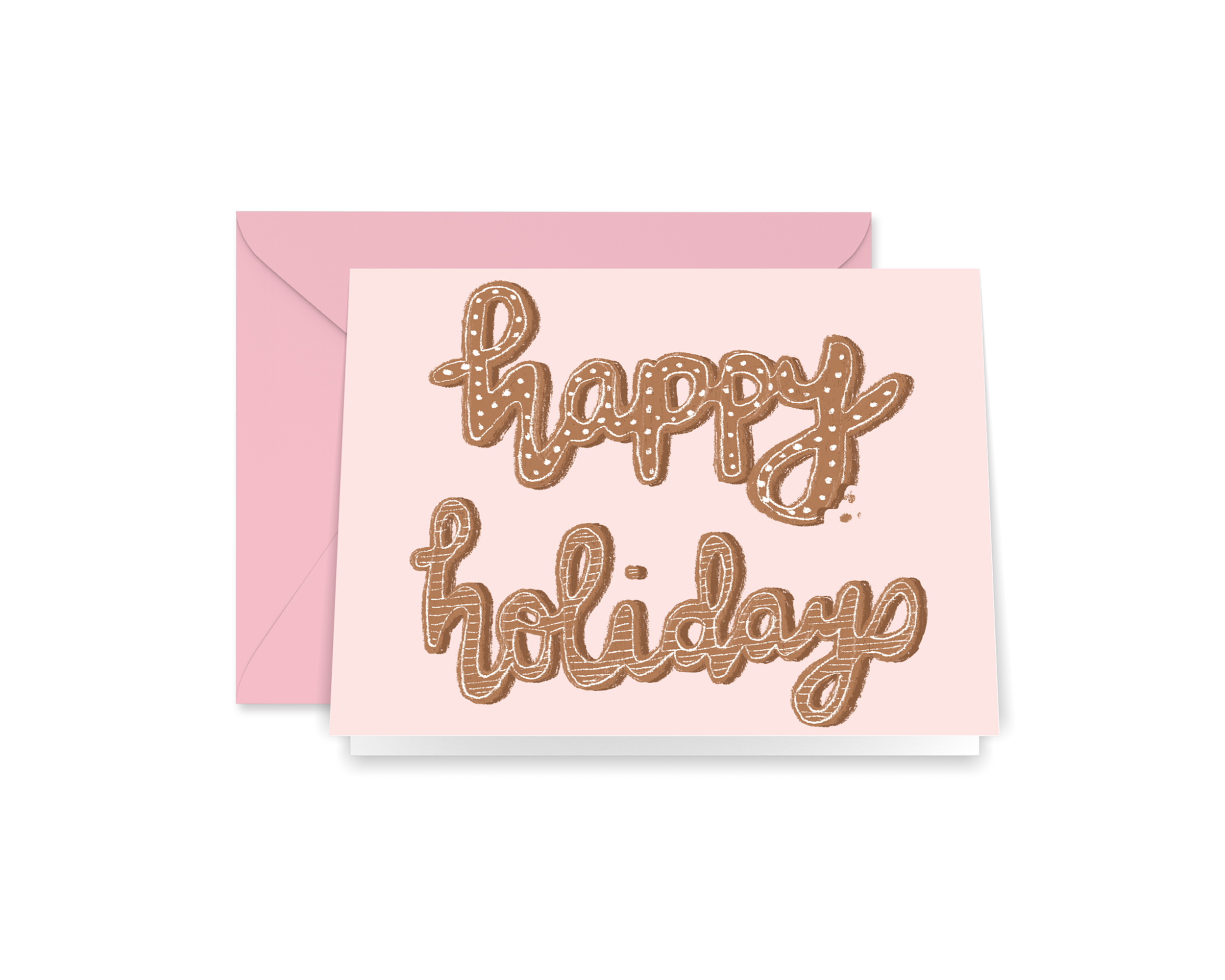 Our greeting cards feature illustrations of the words “happy holidays” as gingerbread cookies. They remind us of days spent in a warm kitchen baking cookies for Santa while the snow quietly falls outside.